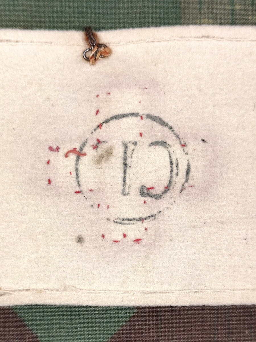 Sie wird mittels drei Haften an Stofflaschen fixiert. Es sind zwei Reihen Stofflaschen vorhanden, um die Grösse einstellen zu können, damit die Armbinde auch auf den Kaput passt.
