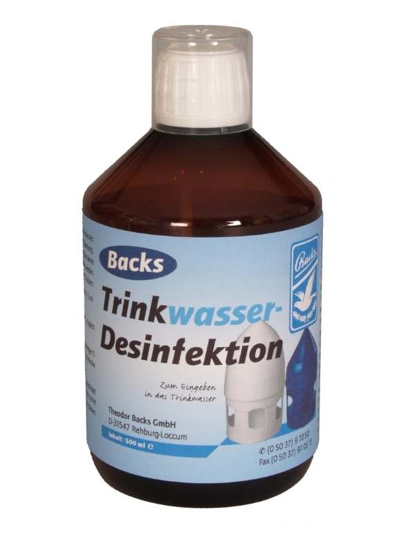 Backs Trinkwasserdesinfektion ist hervorragend geeignet zur Desinfektion des Trinkwassers auf Taubenschlägen, in Geflügel- und Kaninchenställen, sowie im Kabinenexpress. Sie wirkt gegen Bakterien aller Art im Trinkwasser und baut sich selbständig zu 100 % biologisch ab. Dabei besitzt es eine sehr gute Wirksamkeit. 500 ml Trinkwasserdesinfektion sind ausreichend für die Desinfektion von 500 Liter Wasser.