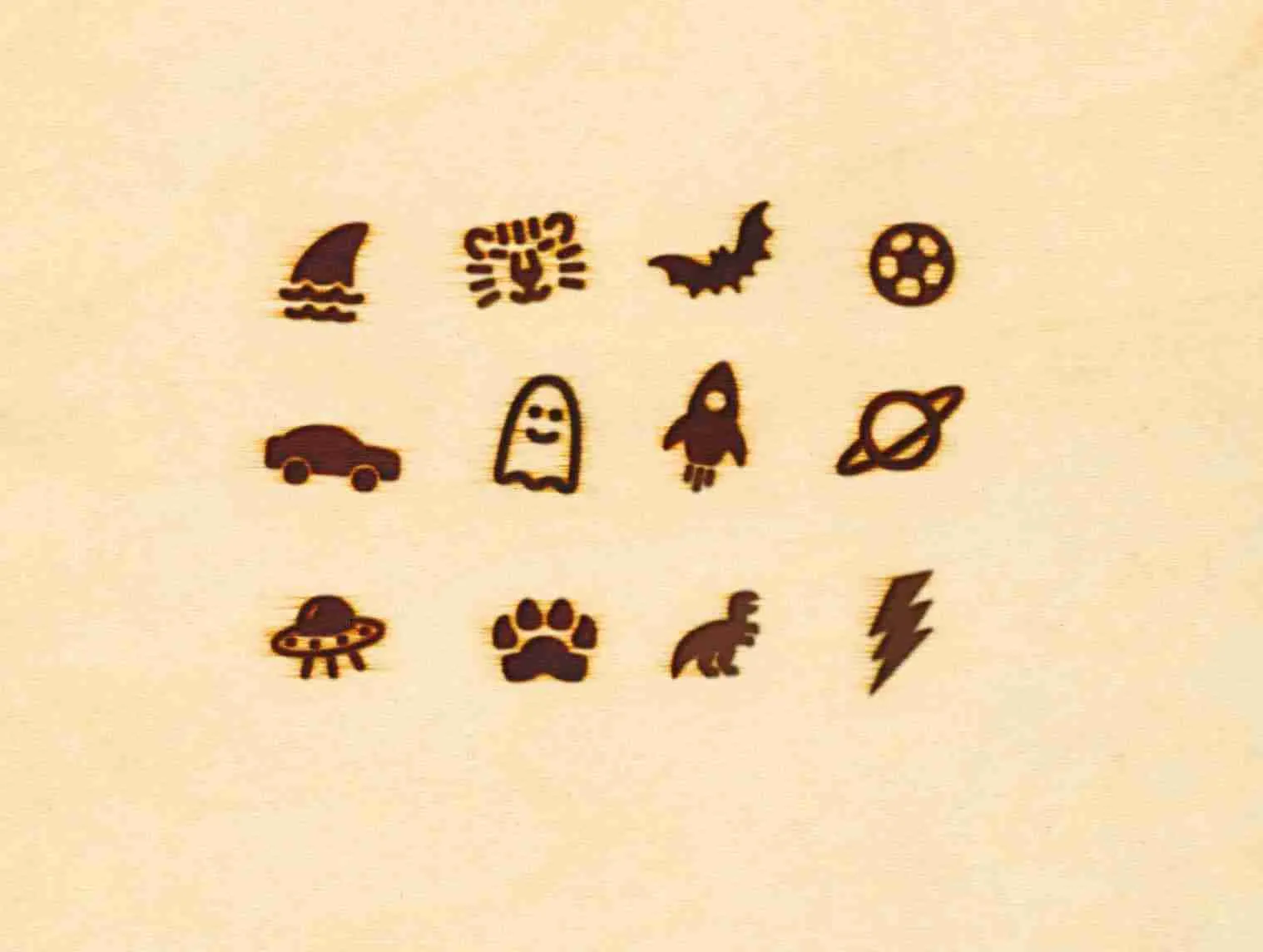 • VIELFÄLTIG: Muster leicht gebrannt! Verschiedene Motive: Haifischflosse, Tiger, Fledemaus, Ball, Auto, Gespenst, Rakete, Planet, UFO, Tierpfotenfußabdruck, Dino, Blitz
