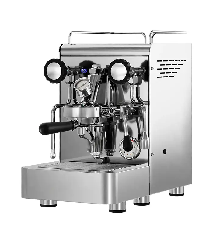 Ausgestattet mit einem 1,5-Liter-Edelstahlkessel mit Wärmetauscher-System (HX) ermöglicht sie die gleichzeitige Ausgabe von Kaffee und Dampf bei stabiler Temperatur. Das Manometer an der Brühgruppe erlaubt eine präzise Druckkontrolle während der Extraktion, während die Vibrationspumpe für gleichmäßigen Druck sorgt.
