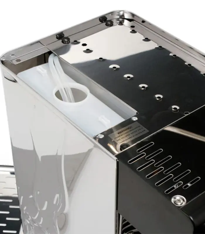 Das 3-Wege-Magnetventil ist eine kommerzielle Funktion, die den Wasserdruck auf den Kaffee entlastet, wenn der Brühschalter ausgeschaltet ist. Es hat eine doppelte Funktion: Es trocknet den Kaffee, um ein Nachtropfen zu verhindern, und erleichtert die Entnahme des Kaffees aus dem Filterhalter in einem Zug. Das Wasser wird in der Tropfschale aufgefangen.