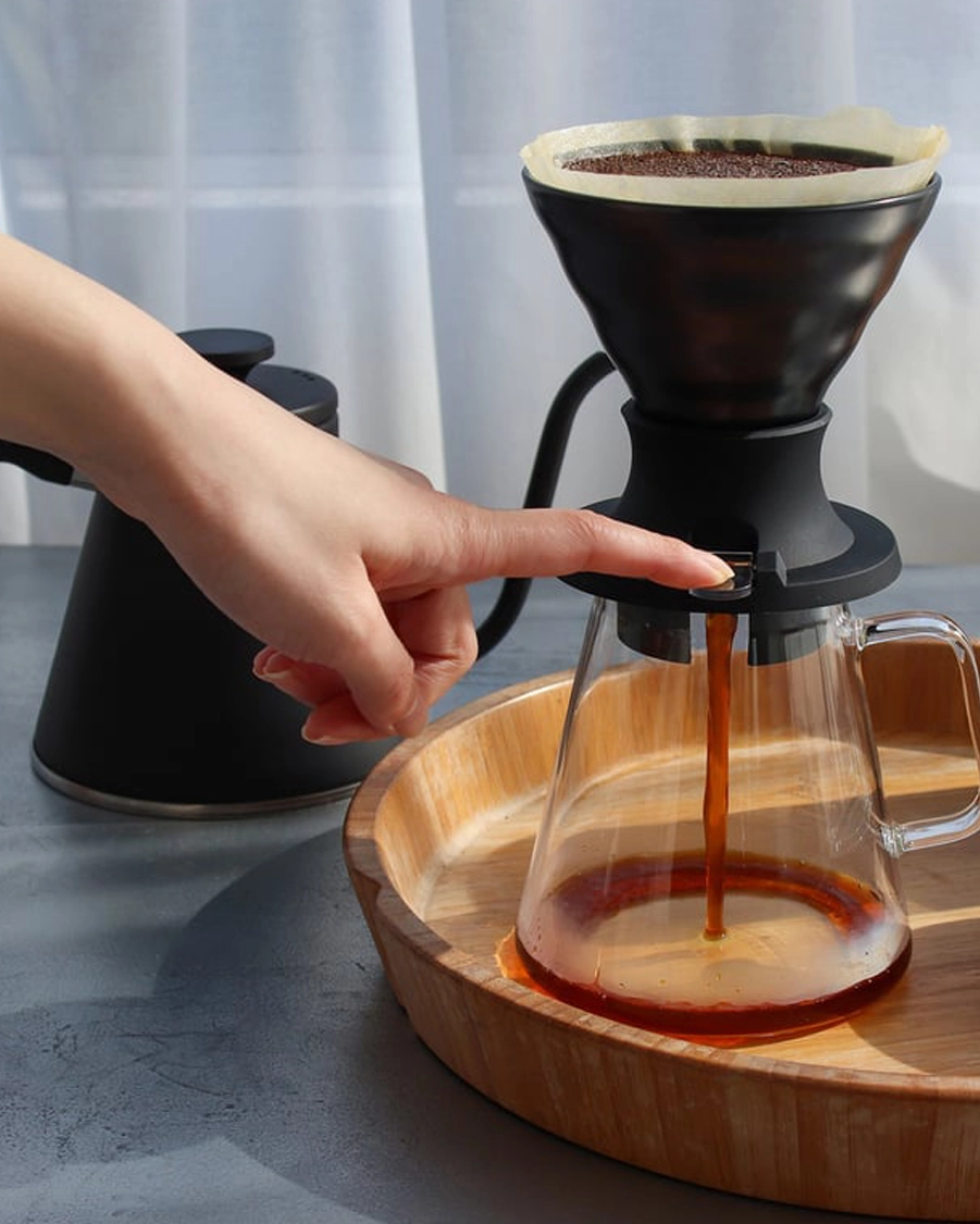 Mit dem Immersion Dripper Switch gelingt jeder Kaffee auf den Punkt. Ein innovativer Mechanismus mit einer Stahlkugel verhindert, dass das Wasser wie beim klassischen Pour-Over sofort in die Tasse fließt. Stattdessen zieht der Kaffee zunächst rund zwei Minuten im Dripper, bevor du den Switch per Knopfdruck betätigen und das volle Aroma in die Tasse gelangt.