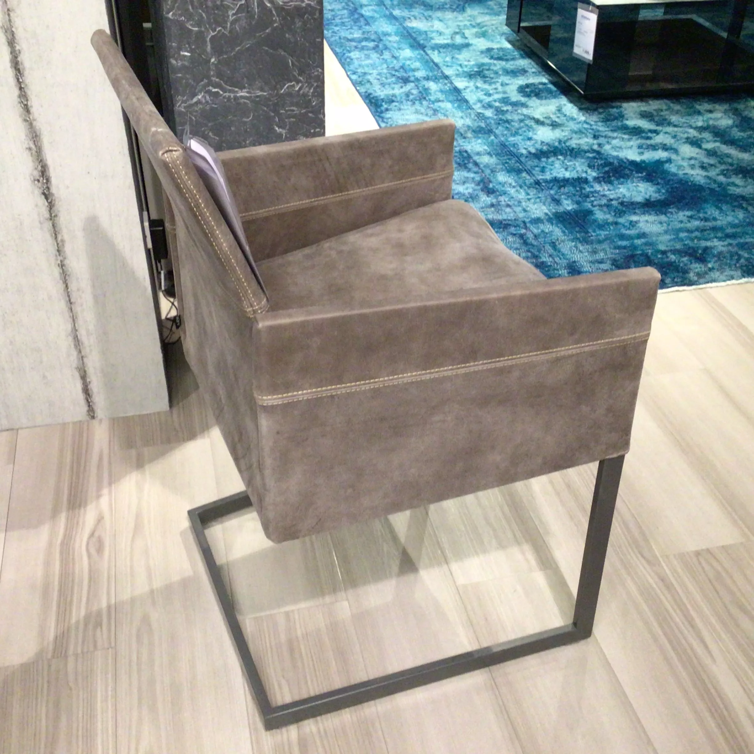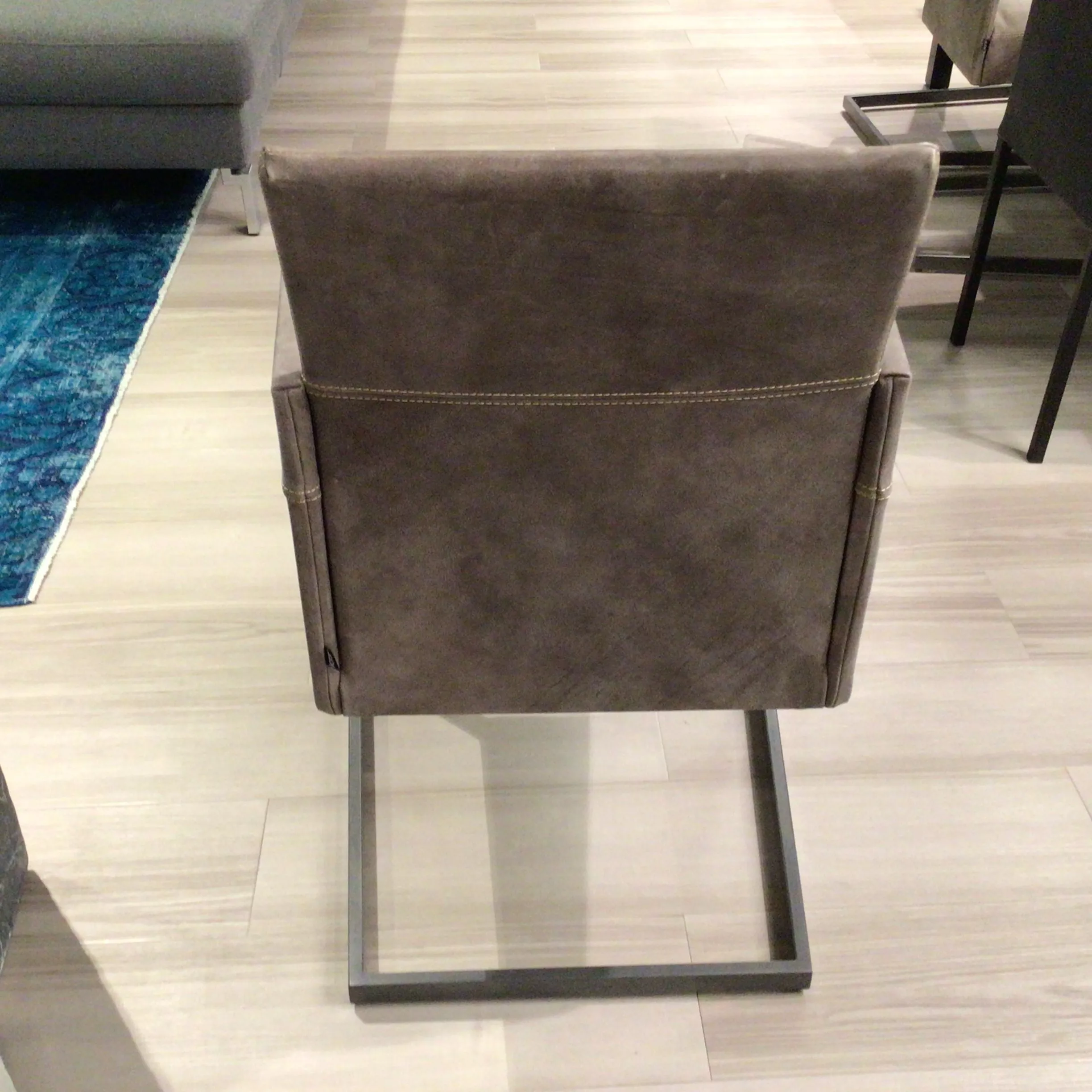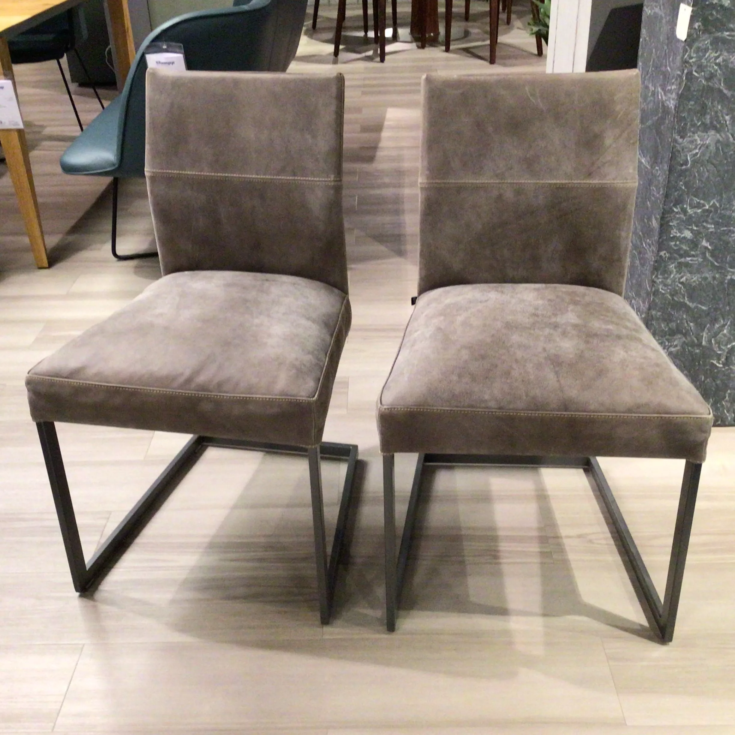 Lederbezogene Armlehnstühle in Graubraun.