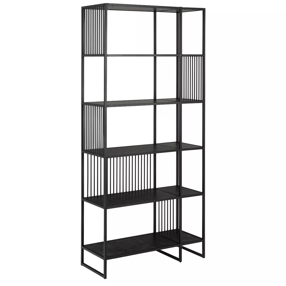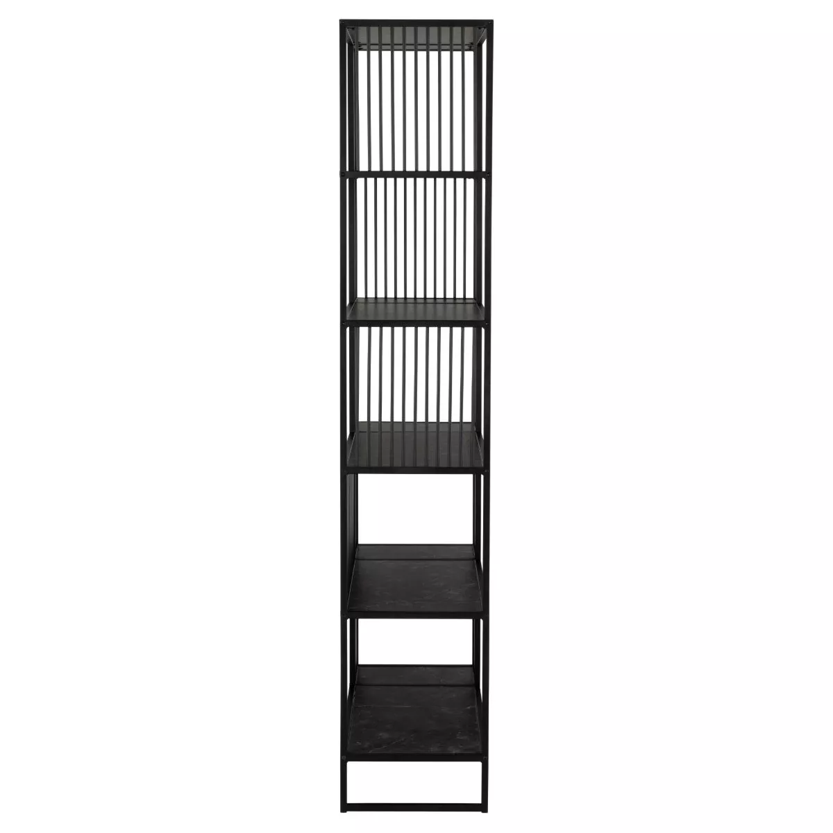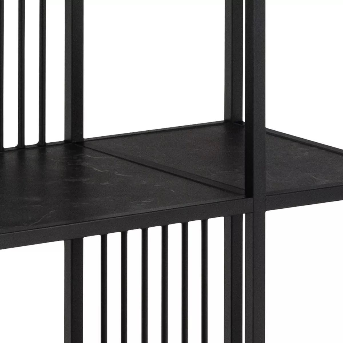 Das Gestell aus schwarz-mattem Stahl sorgt für eine hohe Stabilität und unterstreicht den modernen Industrial-Look. Die dekorativen Streben machen das Regal zum Blickfang und sorgen zusätzlich für die nötige Stabilität. Damit erhalten Sie ein Möbelstück, das sowohl funktional als auch ästhetisch überzeugt.