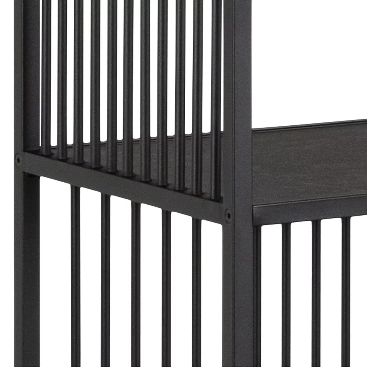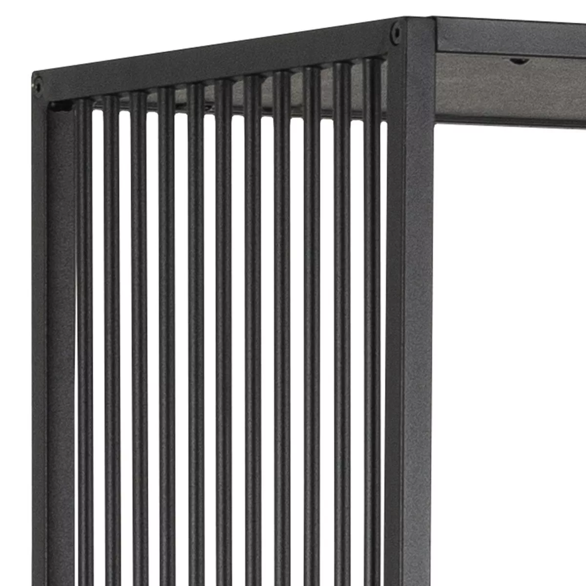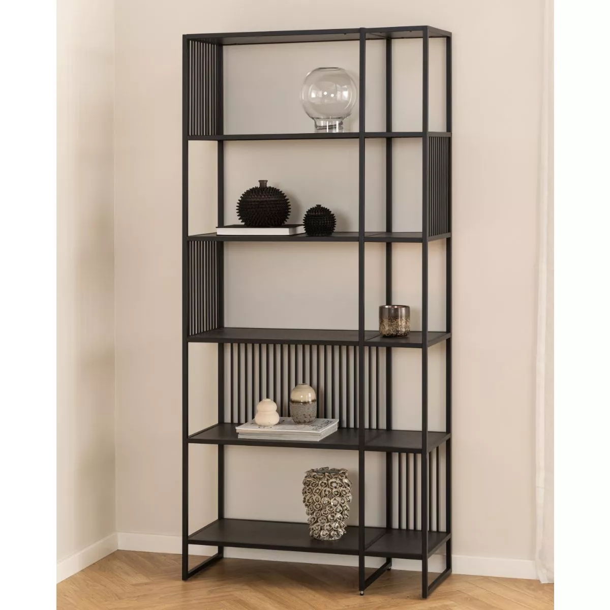 Das Gestell aus schwarz-mattem Stahl sorgt für eine hohe Stabilität und unterstreicht den modernen Industrial-Look. Die dekorativen Streben machen das Regal zum Blickfang und sorgen zusätzlich für die nötige Stabilität. Damit erhalten Sie ein Möbelstück, das sowohl funktional als auch ästhetisch überzeugt.