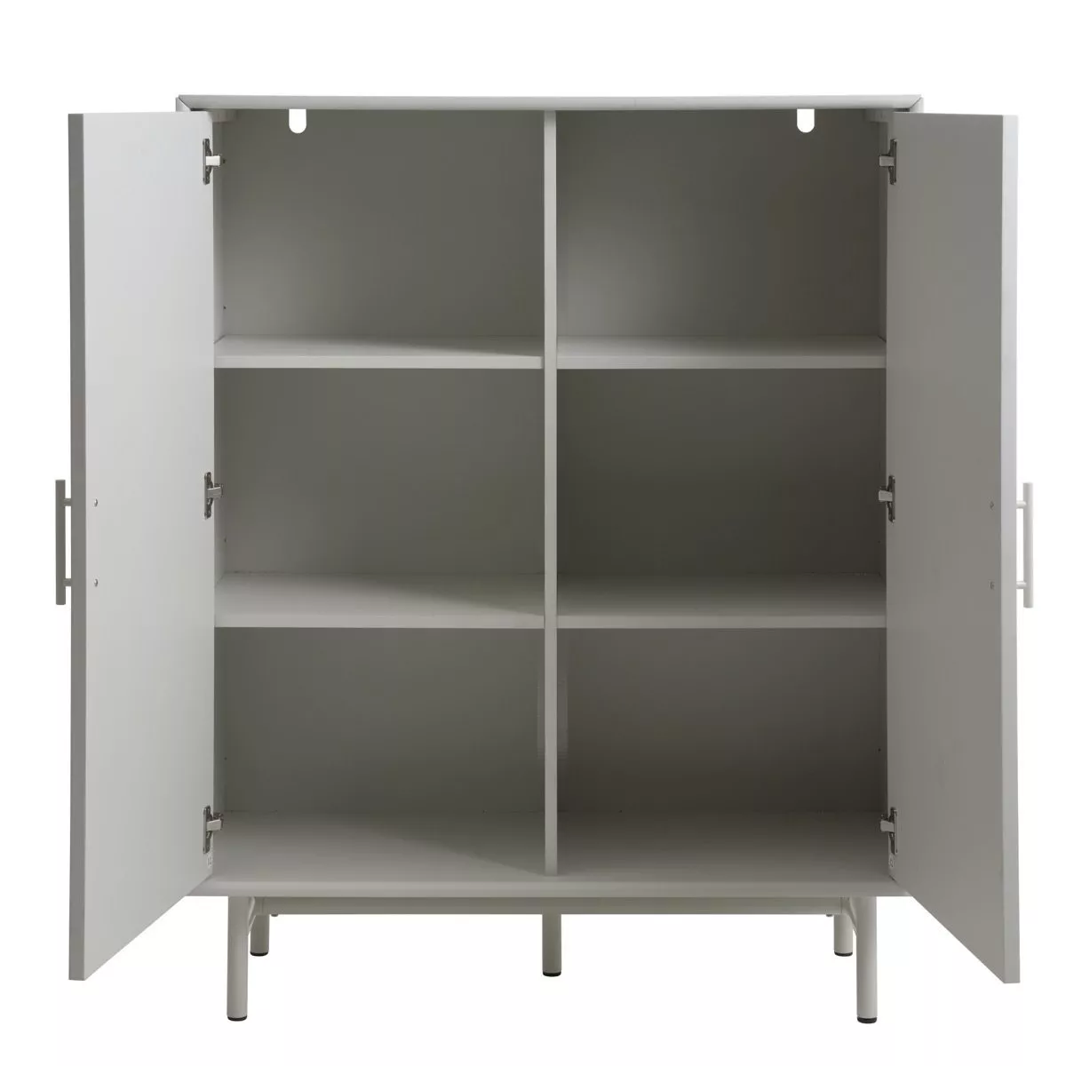Hinter den zwei Türen der Kommode verbergen sich sechs großzügige Fächer, die Ihnen reichlich Stauraum für Ihre persönlichen Gegenstände bieten. Dadurch lässt sich dieses Möbelstück vielseitig in verschiedenen Räumen wie Wohnzimmer, Schlafzimmer oder auch im Flur einsetzen. Ob Kleidung, Bücher oder Dekoration – alles findet in den geräumigen Fächern seinen Platz.