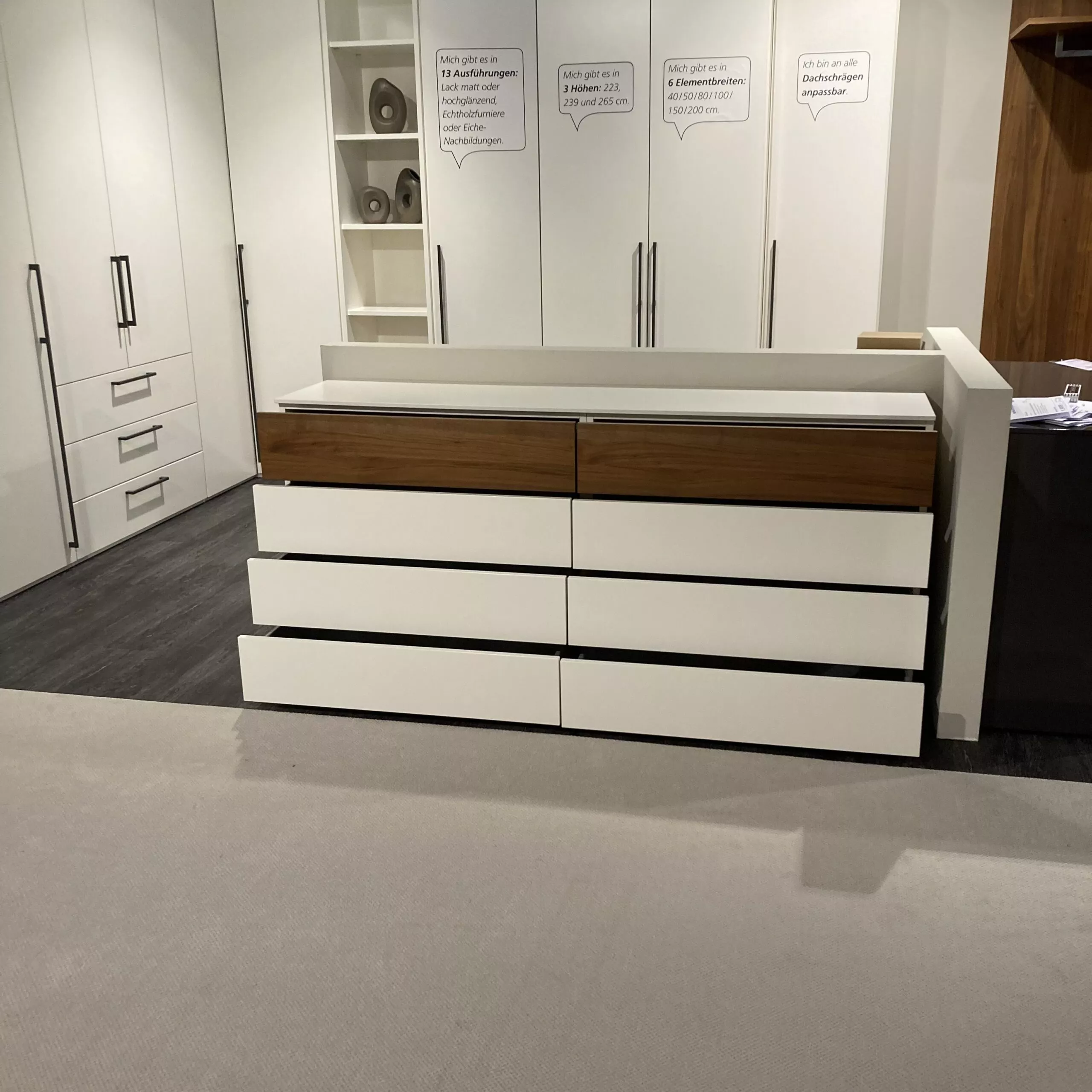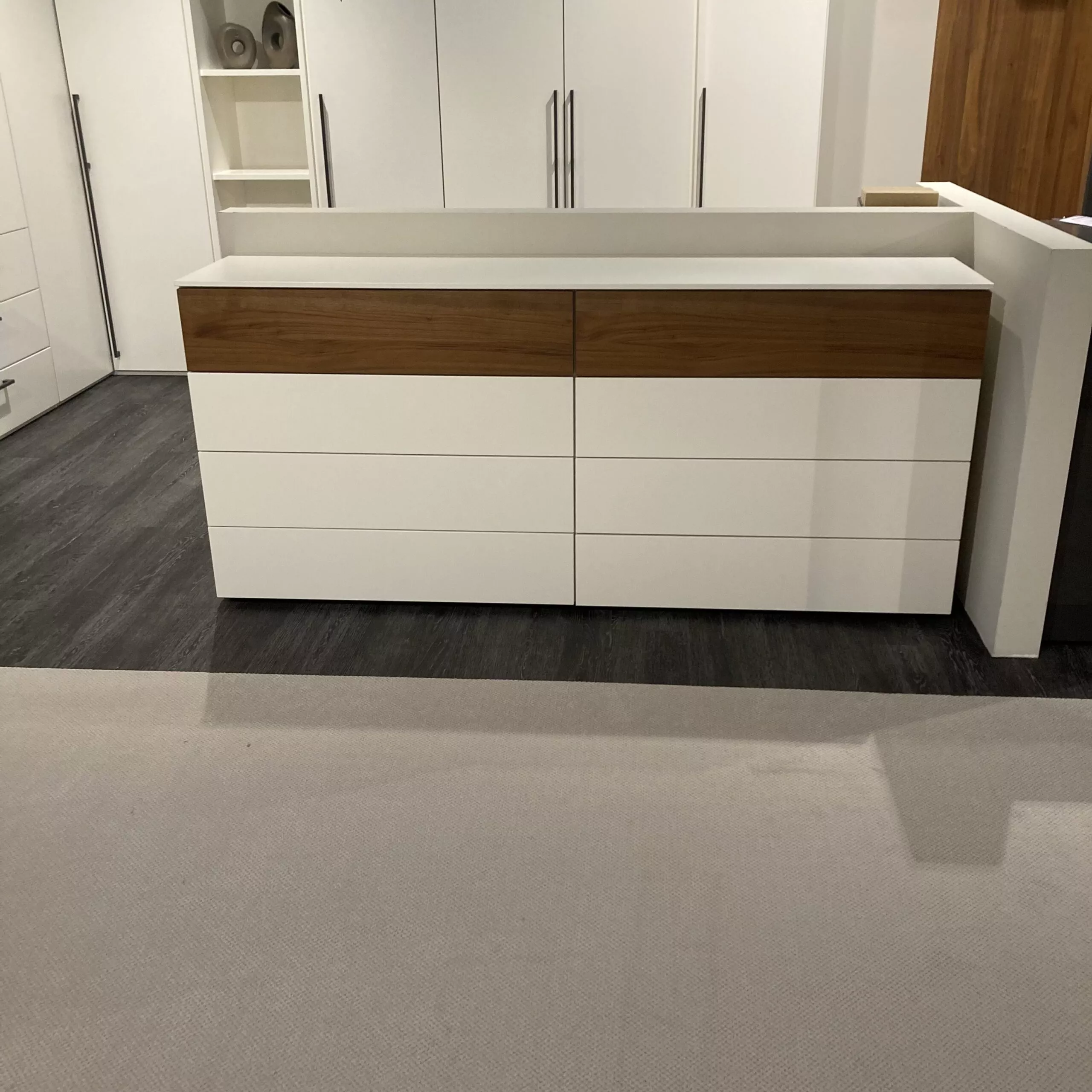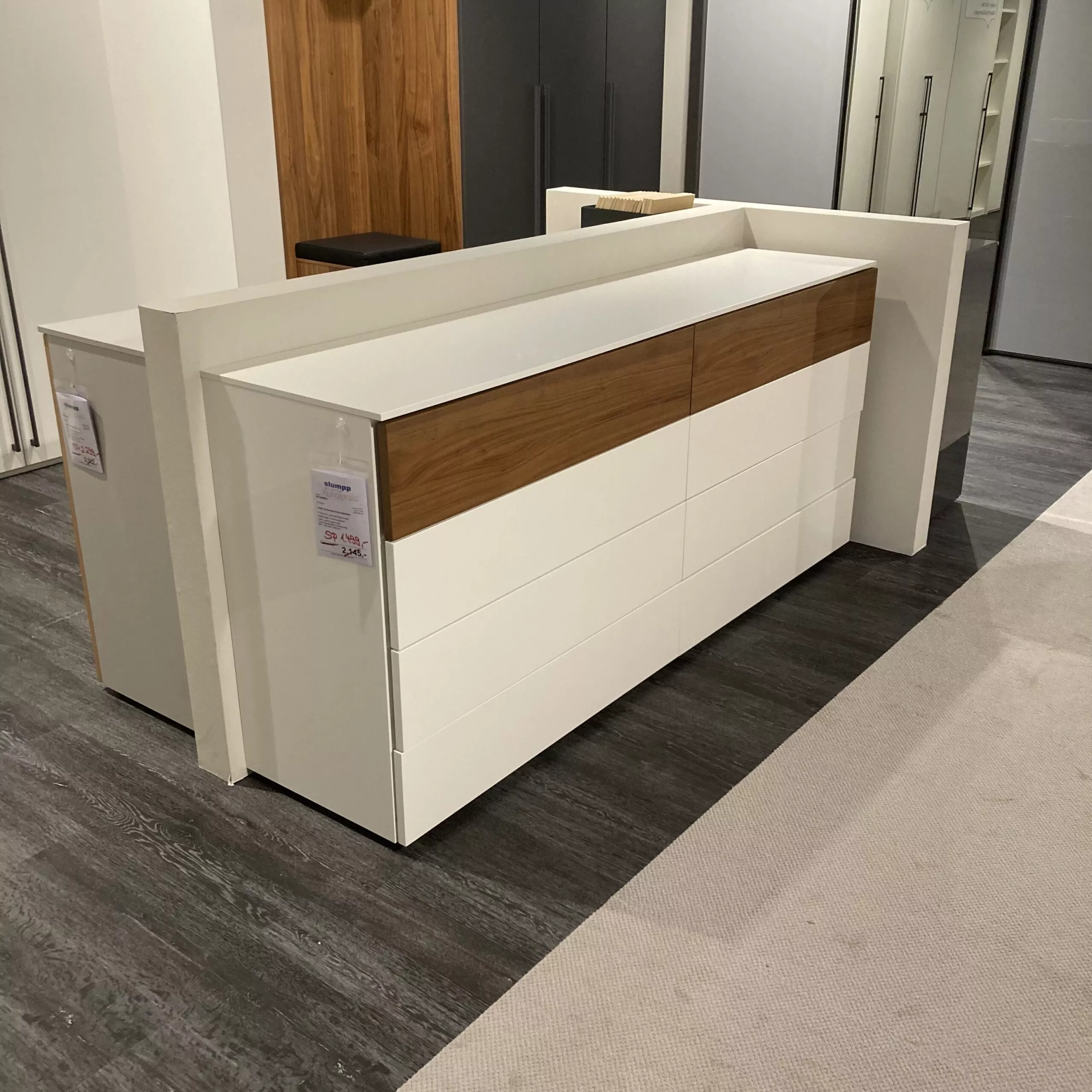 Moderne Kommode von Loddenkemper mit einer Front und einem Korpus aus Lack Bianco in Weiß matt.