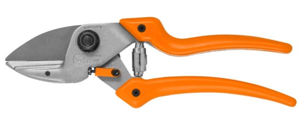 Schere mit Schaukelschnitt und ergonomischem Griff in der Breite verstellbar. Diese schlanke Schere ist dank des speziellen Klingenaustauschmechanismus besonders bequem: Wenn sie äußerlicher positioniert ist, schrauben Sie einfach eine Mutter ab, um sie zu ersetzen, ohne die gesamte Schere zerlegen zu müssen. Darüber hinaus ermöglichen die in der Breite einstellbaren Griffe und die unterschiedliche Form des oberen und unteren Griffs einen festen und äußerst bequemen Griff. Eine Astschere der neuen Generation mit einem perfekten zentralen Schwenkschnitt.