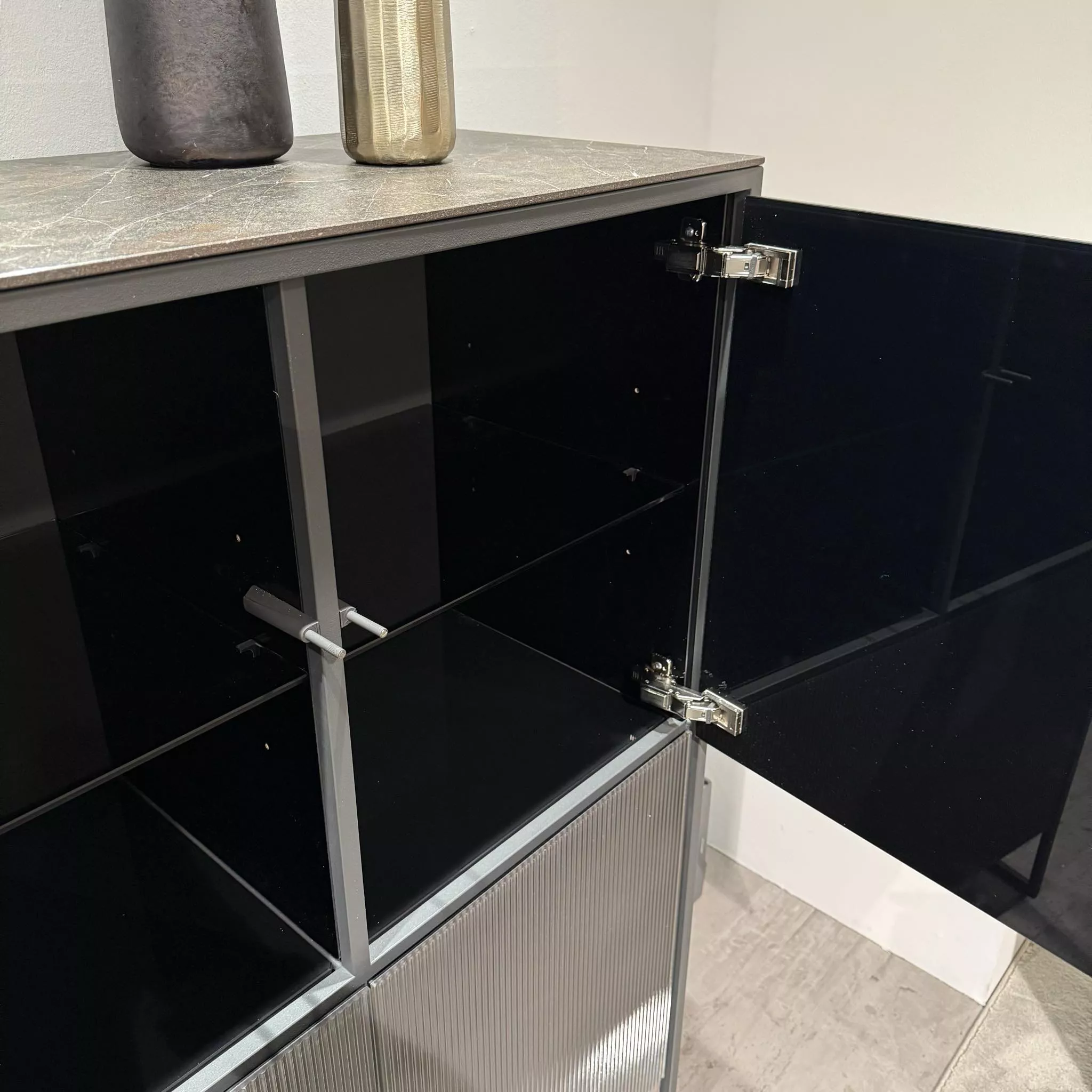 Das Highboard von Mobliberica besticht durch sein modernes Design und hochwertige Verarbeitung. Der Korpus besteht aus Glas in Anthrazit, das für einen edlen Look sorgt. Das Gestell aus Metall in Anthrazit ergänzt das Design perfekt. Ausgestattet mit vier Türen bietet das Highboard viel Stauraum und ist ein stilvoller Hingucker für jedes Zuhause. Das Highboard kann gerne vor Ort in unserer Ausstellung in Lauchringen besichtigt werden.