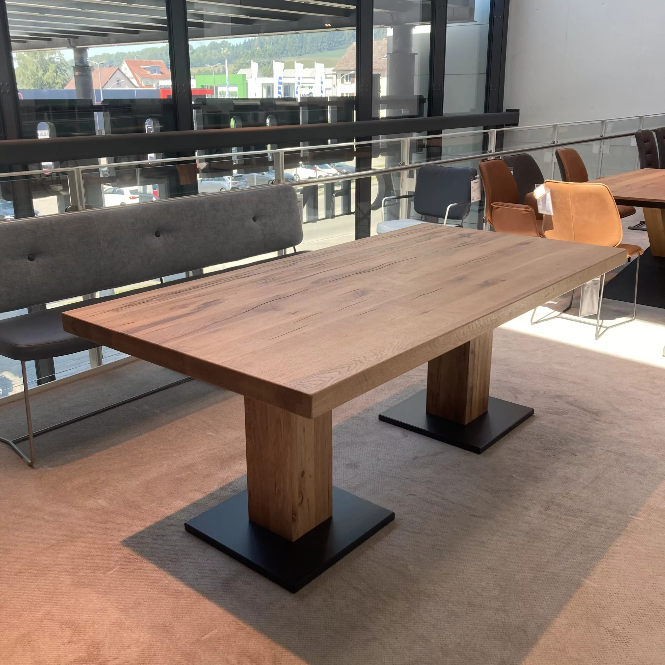 Massiver Esstisch von Musterring mit einer Tischplatte aus Balkeneiche massiv in Natur.