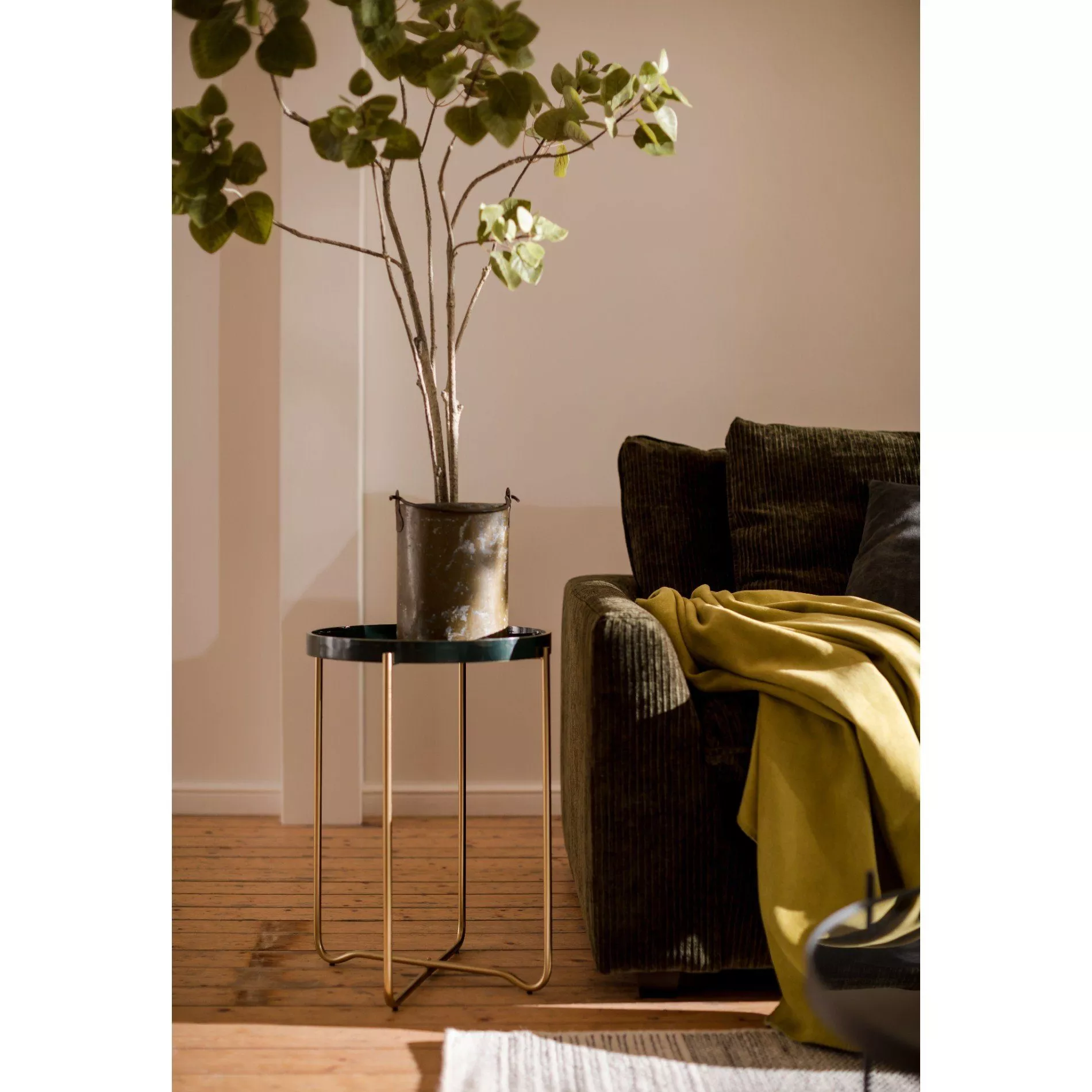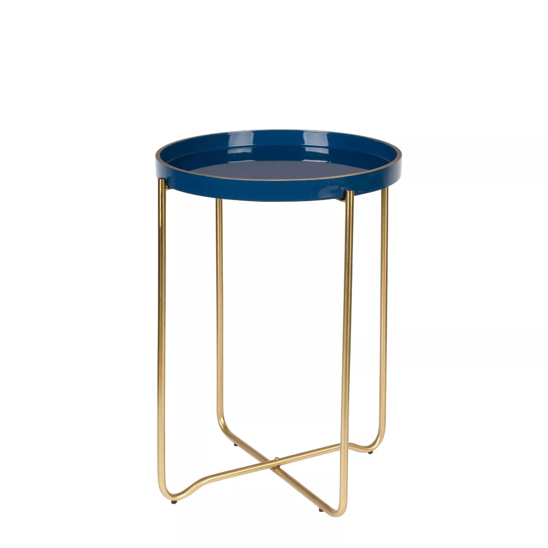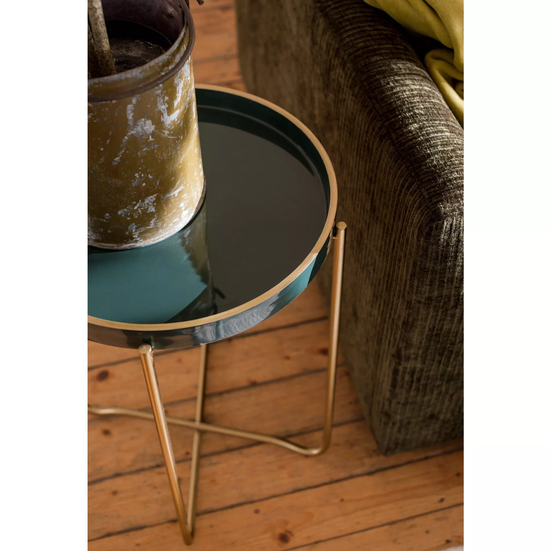 Der Beistelltisch fällt mit seiner satten Farbgebung gleich ins Auge. Das goldfarbene, geschwungene Metallgestell lässt Ihren Raum erstrahlen und ist zudem bis zu einem Gewicht von 5 kg belastbar. Die runde Aluminiumplatte ist emaillebeschichtet und steht in der Ausführung dunkelblau oder dunkelgrün zur Auswahl. Die dunklen Farbtöne der Ablageplatte wirken beruhigend und bilden mit dem hellen Gestell einen attraktiven Kontrast.
