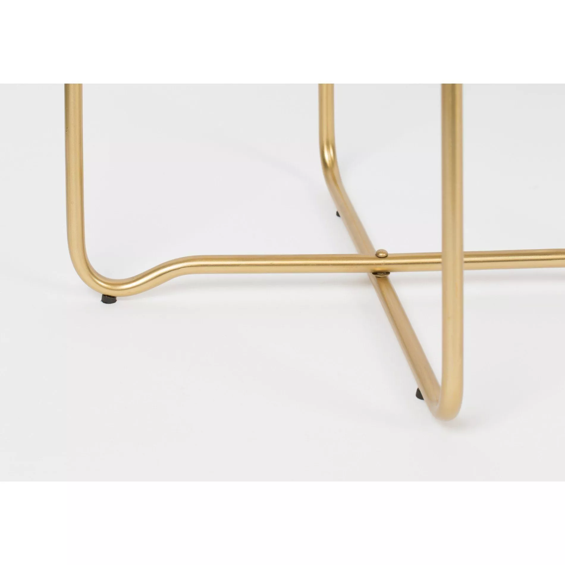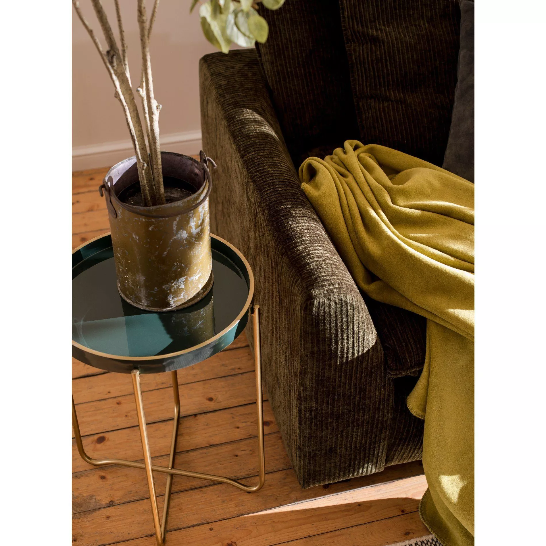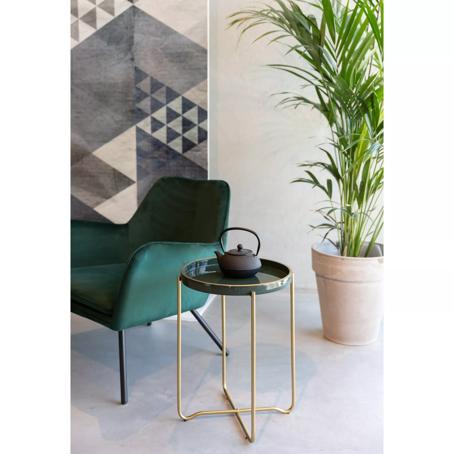 Der Beistelltisch fällt mit seiner satten Farbgebung gleich ins Auge. Das goldfarbene, geschwungene Metallgestell lässt Ihren Raum erstrahlen und ist zudem bis zu einem Gewicht von 5 kg belastbar. Die runde Aluminiumplatte ist emaillebeschichtet und steht in der Ausführung dunkelblau oder dunkelgrün zur Auswahl. Die dunklen Farbtöne der Ablageplatte wirken beruhigend und bilden mit dem hellen Gestell einen attraktiven Kontrast.