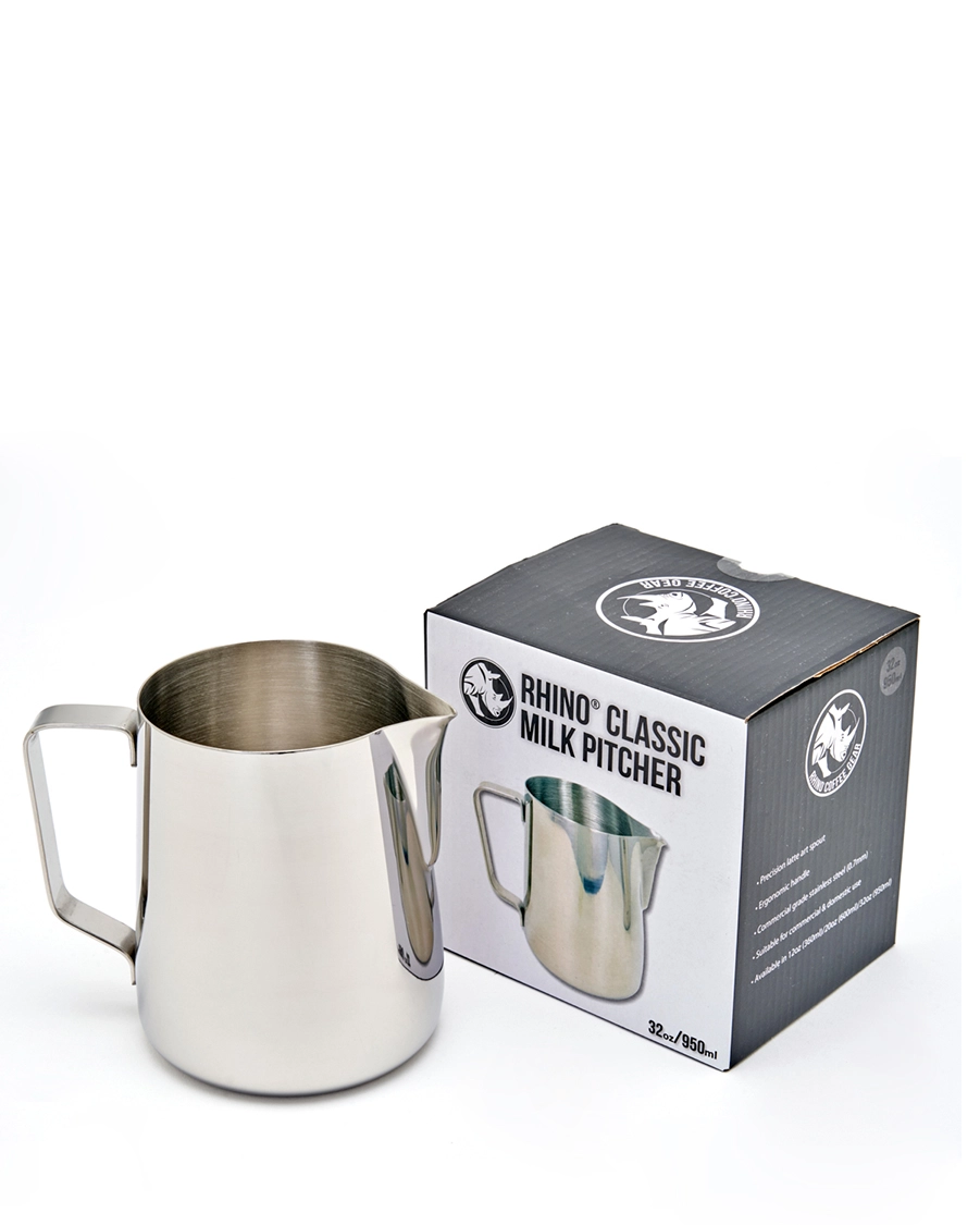 Mit dem Rhino Milchkännchen poliert 950ml von Rhinowares wird das Milchaufschäumen für dich kinderleicht. Das Barista-Milchkännchen besteht aus rostfreiem Edelstahl und hat eine Wandstärke von einem Millimeter. Hierdurch bleibt die Milch beim Aufschäumen länger kühl und erleichtert es dir feinen Milchschaum zu bilden. Dank des Gewichts liegt das Milchkännchen besonders angenehm in der Hand, was dir eine leichtere Handhabung ermöglicht. Durch den leicht konkaven Ausguss am Rhino Milchkännchen poliert 950ml ist der Milchstrahl beim Ausschenken gerade und gefasst. Das besondere, er bietet dir die besten Voraussetzungen zum einfachen Kreieren von Latte Art.