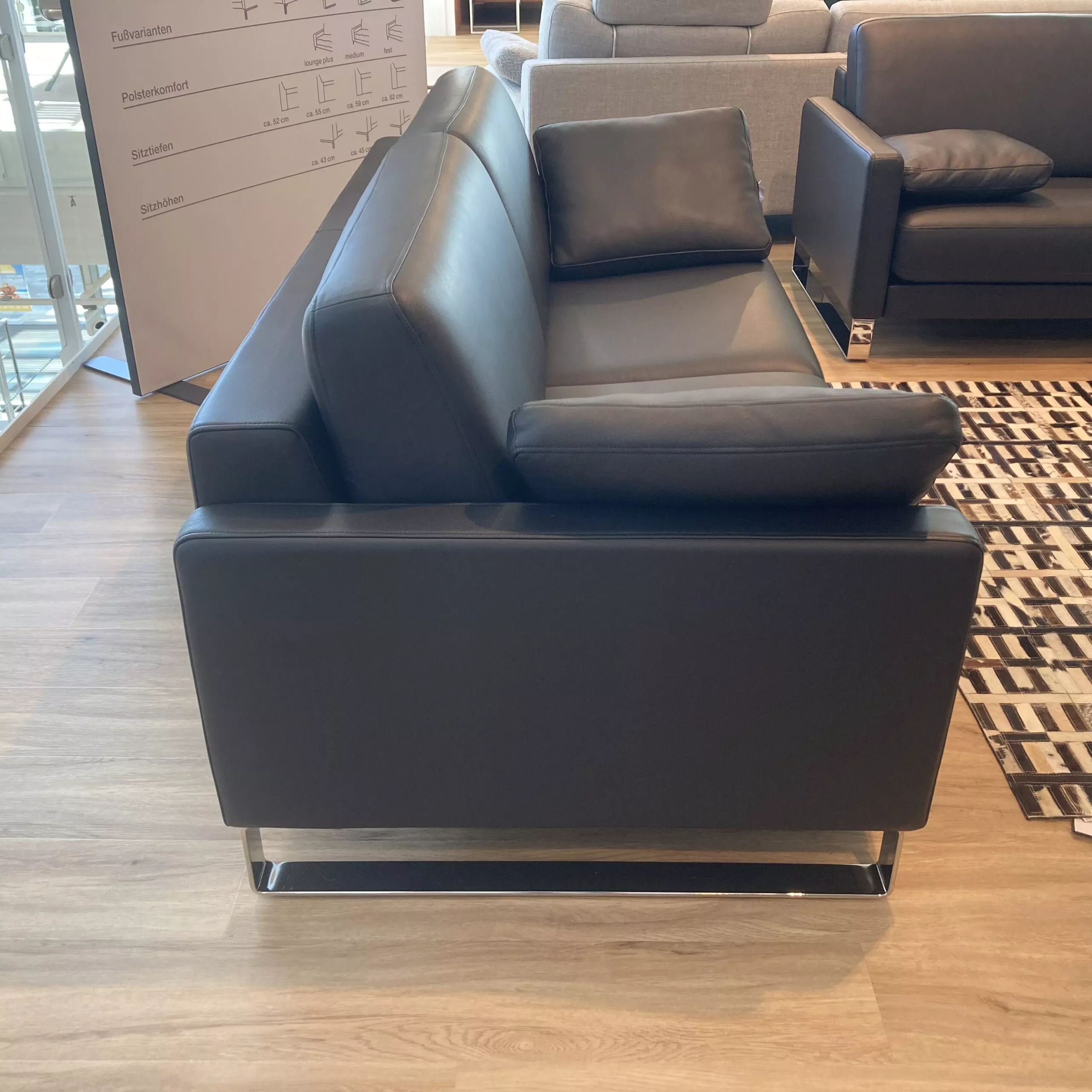 Das Sofa SOB-G Ego/SB 168 von Rolf Benz vereint luxuriöses Design mit hochwertiger Verarbeitung: edler Lederbezug in Dunkel-Verkehrschwarz, stabiles Gestell mit Glanzchrom-Kufen und festes Sitzkissen sorgen für Komfort. Zwei passende Ego-Kissen runden das elegante Erscheinungsbild stilvoll ab – für modernes Wohnen mit Klasse. Das Sofa kann gerne vor Ort in unserer Ausstellung in Stockach besichtigt werden.