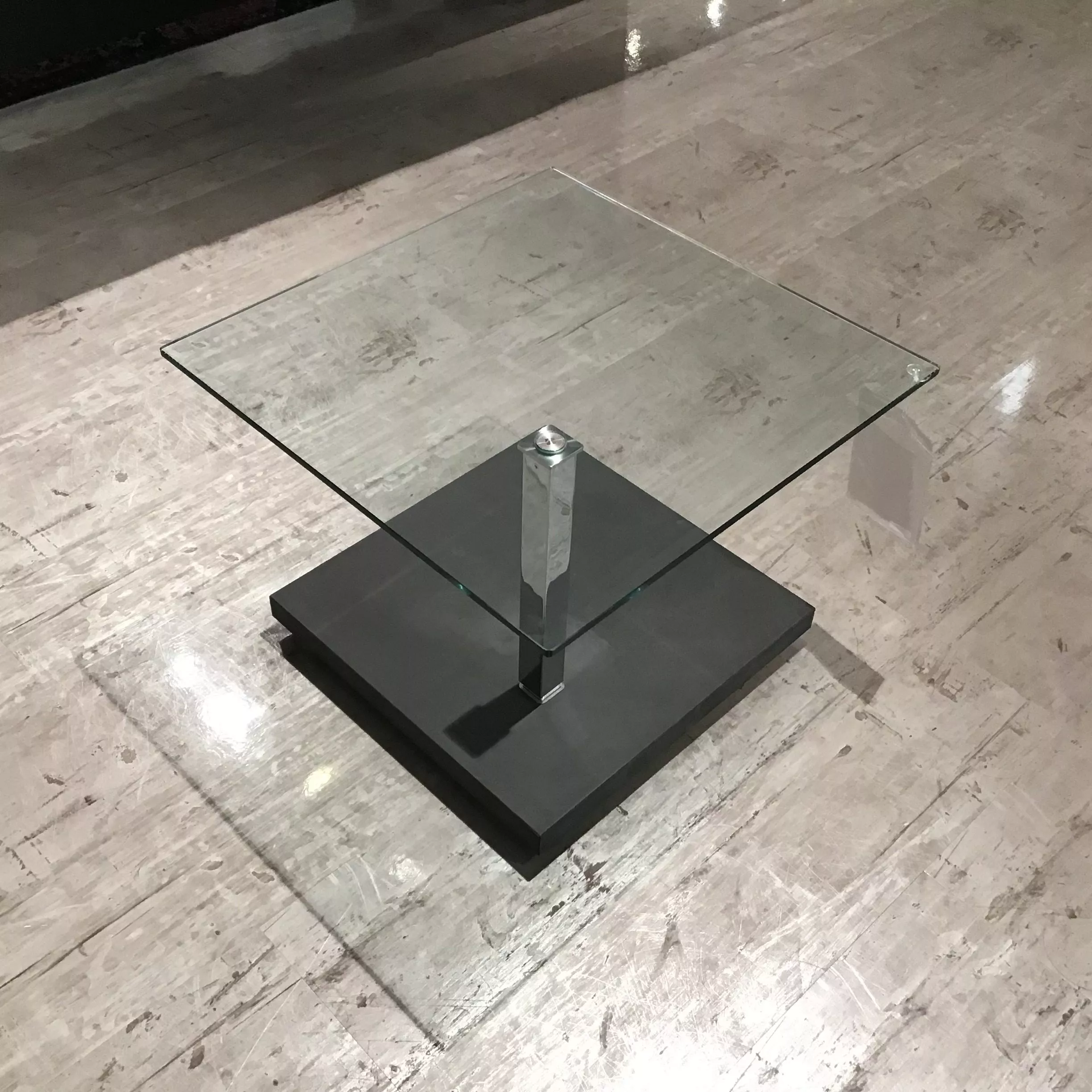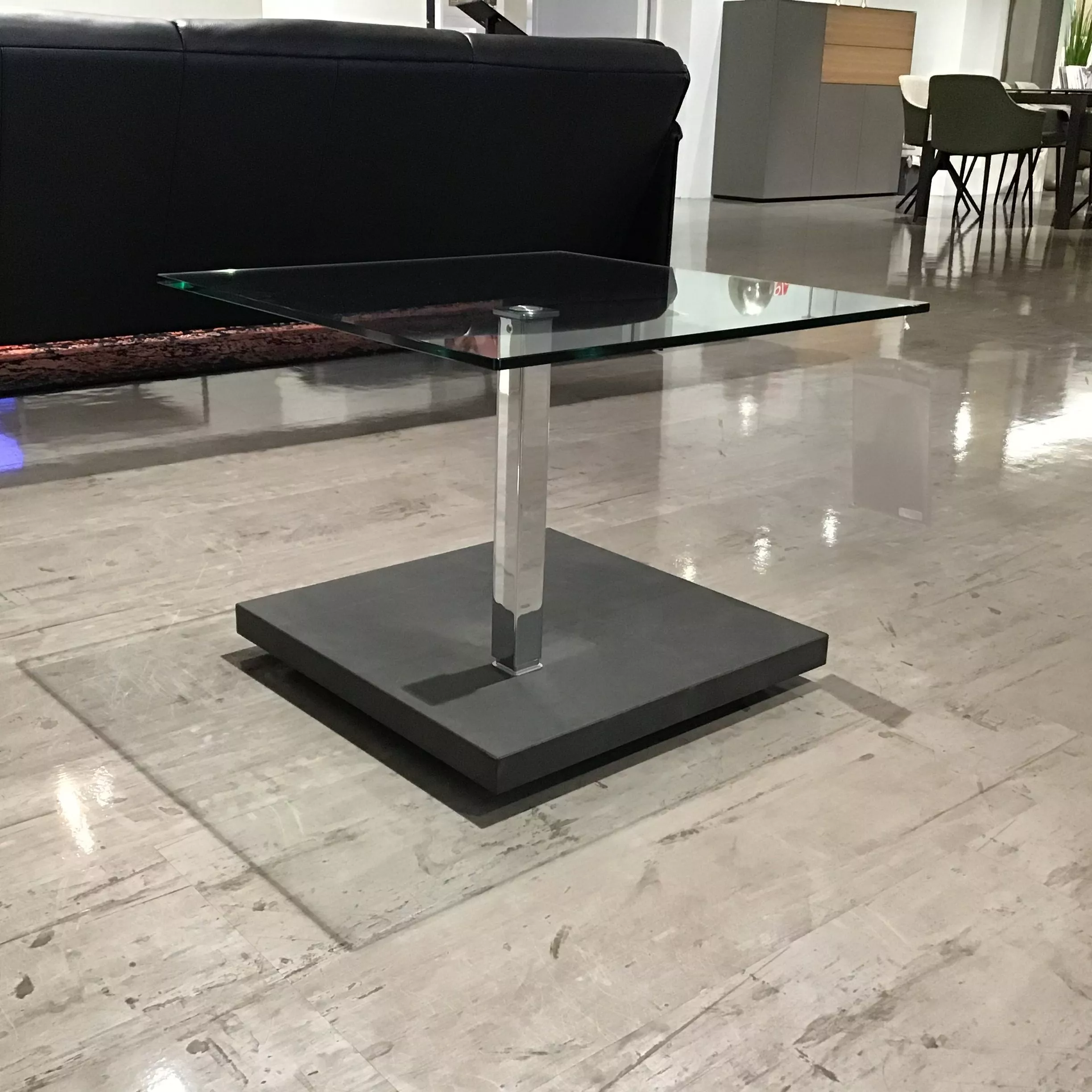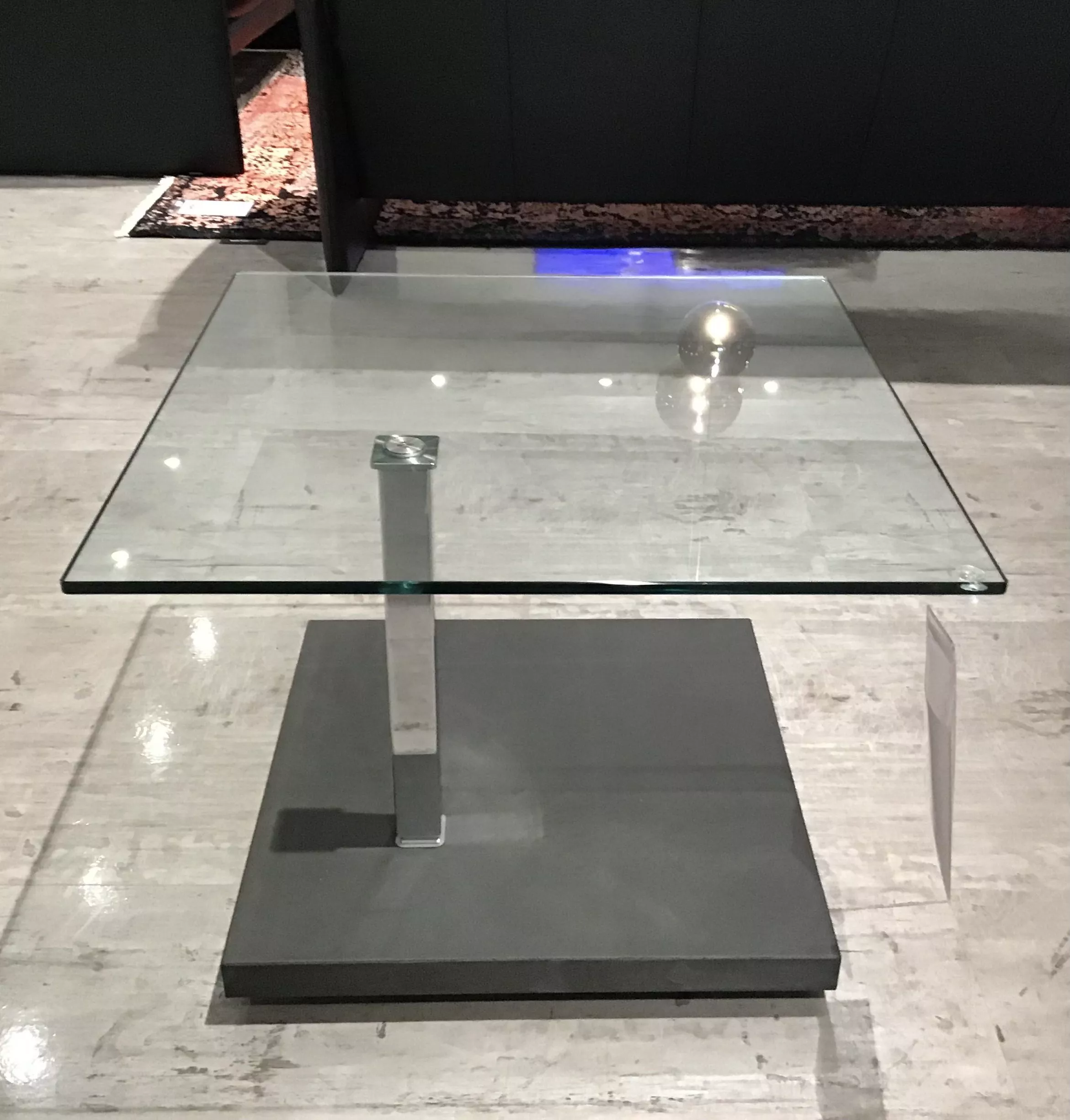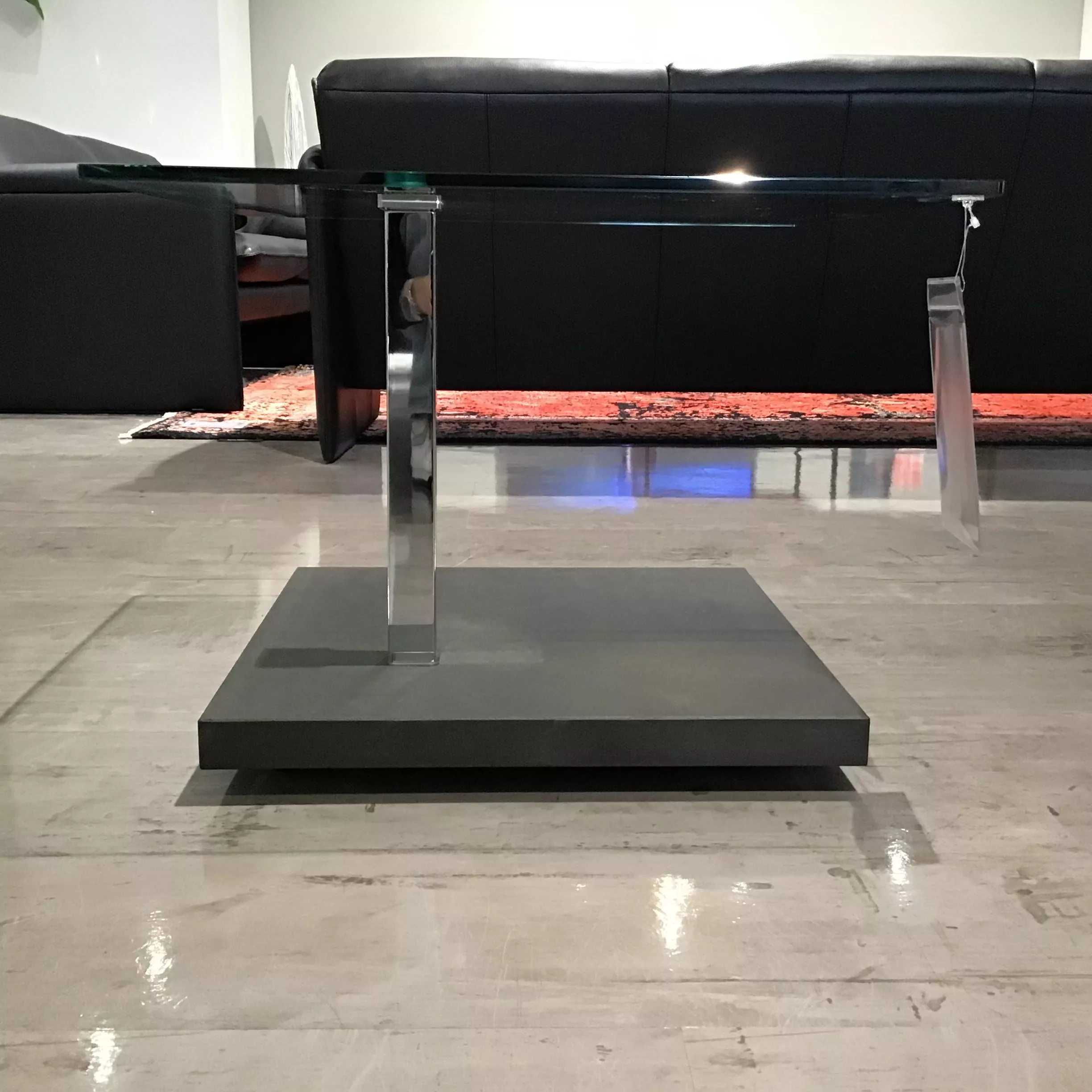Moderner Couchtisch von Ronald Schmitt mit klarer Floatglas-Tischplatte, hochglanzverchromten Edelstahlgestell und Bodenplatte in Betonoptik Dark, höhenverstellbar.