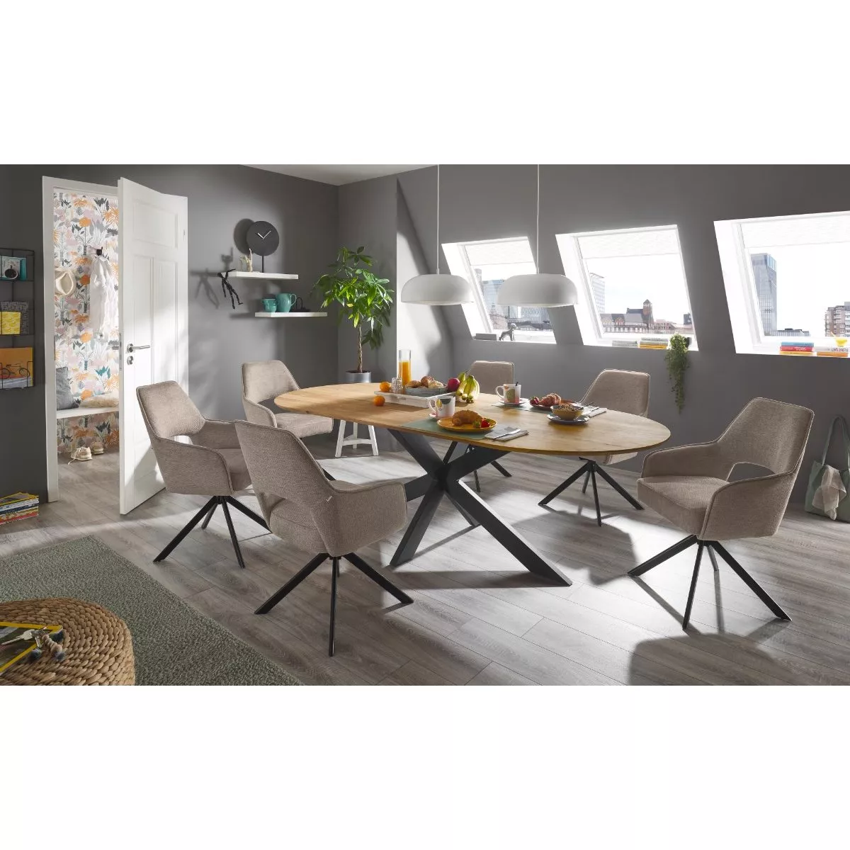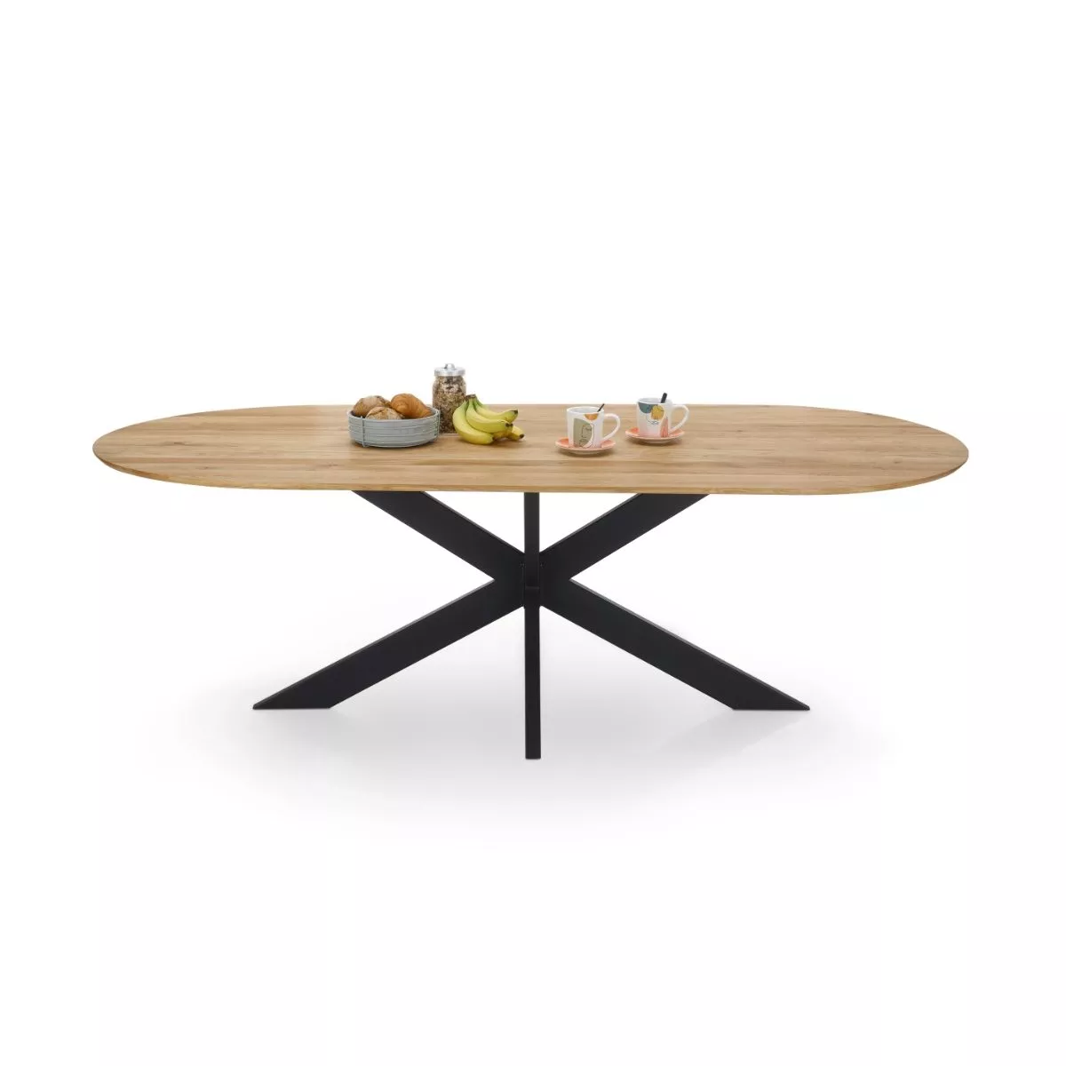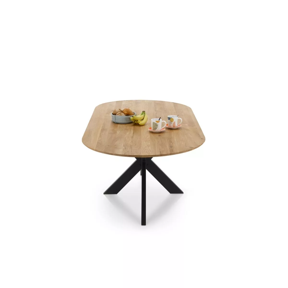 Warmes Holz trifft auf cooles Metall. So lässt sich der Look von dem Lakewood Esstisch treffend beschreiben. Das Eichenholz der oval geformten Tischplatte mit individuellen Maserungen verleiht jedem Tisch seinen unverwechselbaren Charakter und macht ihn zum Unikat. Die nach innen verjüngte Kante, auch Schweizer Kante genannt, lässt die weich geformte Platte noch filigraner wirken.