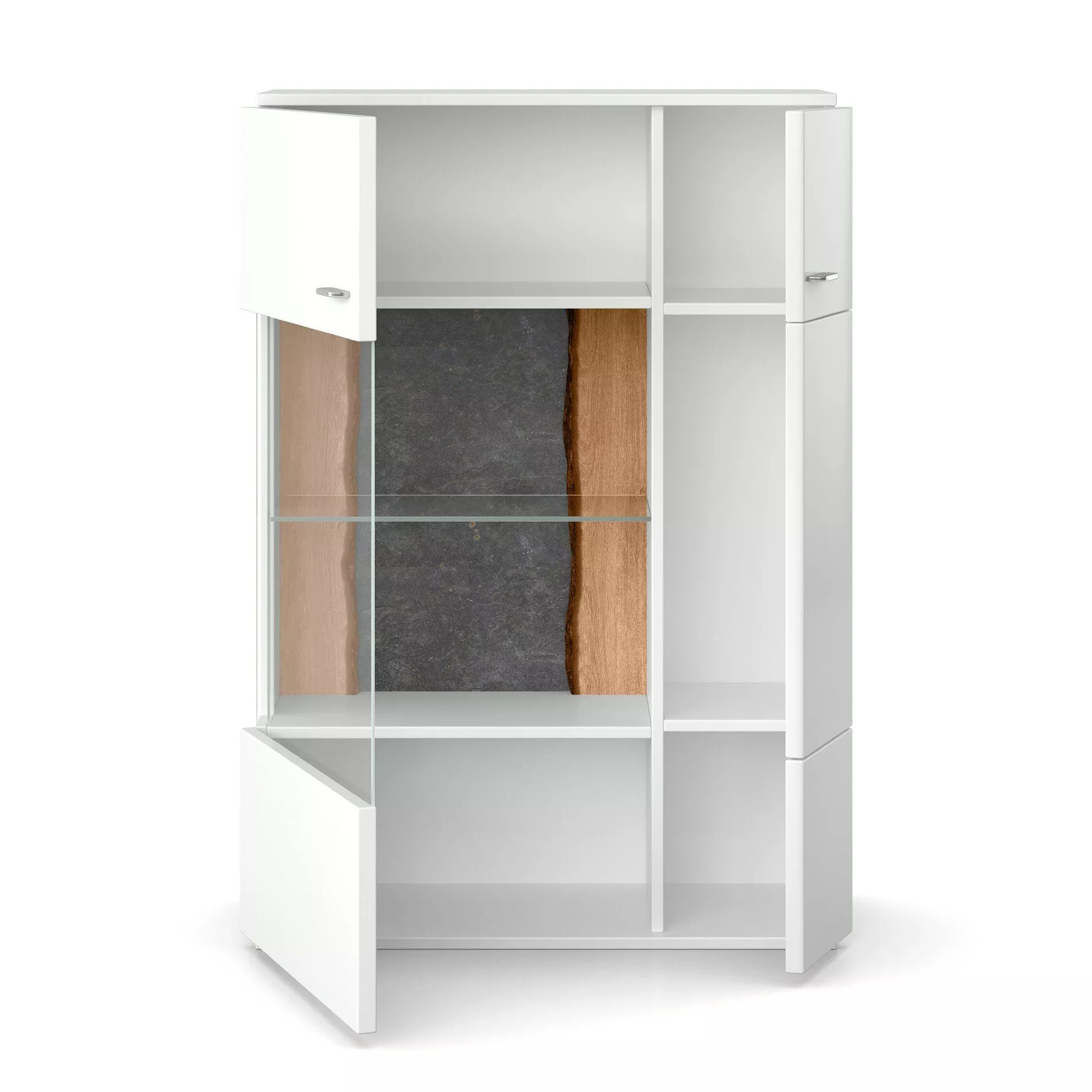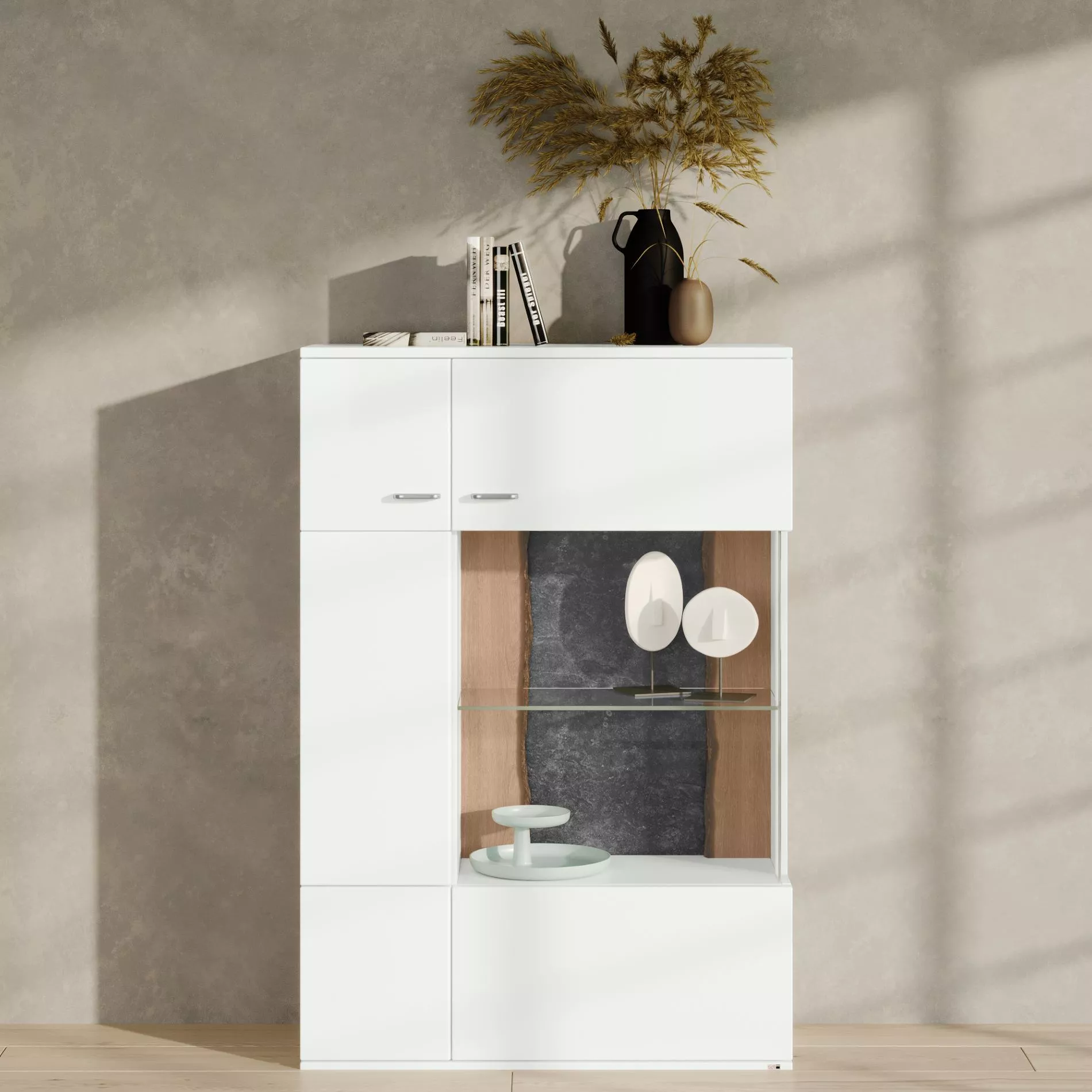 Hinter den Türen verbergen sich Fächer und Einlegeböden, die Ihnen Platz bieten, alles zu verstauen, was nicht sichtbar sein soll. Durch die praktische Soft-Close-Funktion schließen die Türen stehts sanft, auch wenn sie mit viel Schwung zugeworfen werden. In dem Glasausschnitt lassen sich beispielsweise schöne Gläser oder Dekoelemente perfekt in Szene setzen und die LED-Beleuchtung bringt zusätzlich eine warme Atmosphäre in Ihr Wohnzimmer. Die Kombination aus dem modernen Arctic weiß außen, und dem natürlichen Rindholz in der Rückwand, macht das Highboard zu einem tollen Einzelstück. Durch die vielen weiteren Modelle, die die Serie Tacoma bietet, könne Sie aber auch mehrere Möbelstücke perfekt kombinieren.