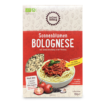 Die Hack Produkte aus Sonnenblumenprotein der sunflowerfamily sind eine absolute Weltneuheit: Fleischersatz aus Sonnenblumenkernen – Eine echte Alternative zu Soja! Mit den Sonnenblumenhack Produkten kann man grundsätzlich alles kochen, was man auch mit Hackfleisch machen kann. Der leichte Geschmack nach Sonnenblumenkernen gibt dem Gericht eine leckere nussige Note. Das Hack muss nicht eingeweicht werden, sondern nur einmal mit Wasser benetzt werden. Da das Hack zu 100% aus Sonnenblumenkernen besteht, gibt es keine Probleme mit Unverträglichkeiten. Die sunflowerfamily verzichtet bewusst auf Soja, deshalb ist das Produkt auch frei von Spuren.