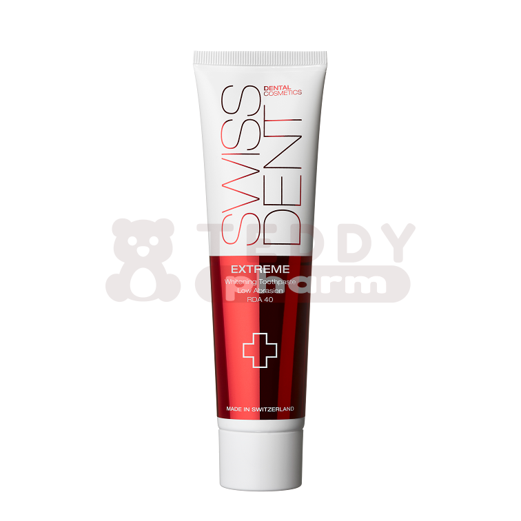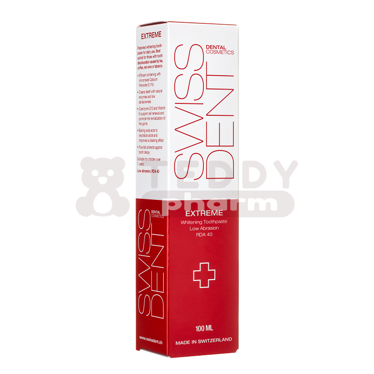 Extrem wirksame Formel mit einer doppelten Dosis von natürlichen Enzymen und Nanoxyd enthält Speisesoda, die die äußere markante Pigmentation wirkungsvoll entfernt. Das zugegebene Coenzym Q10 und Vitamin E revitalisieren das Zahnfleisch und sorgen für dessen Gesundheit. Der markante Menthol-Geschmack der Zahnpaste Swissdent Extreme erfrischt den Atem für mehrere Stunden.