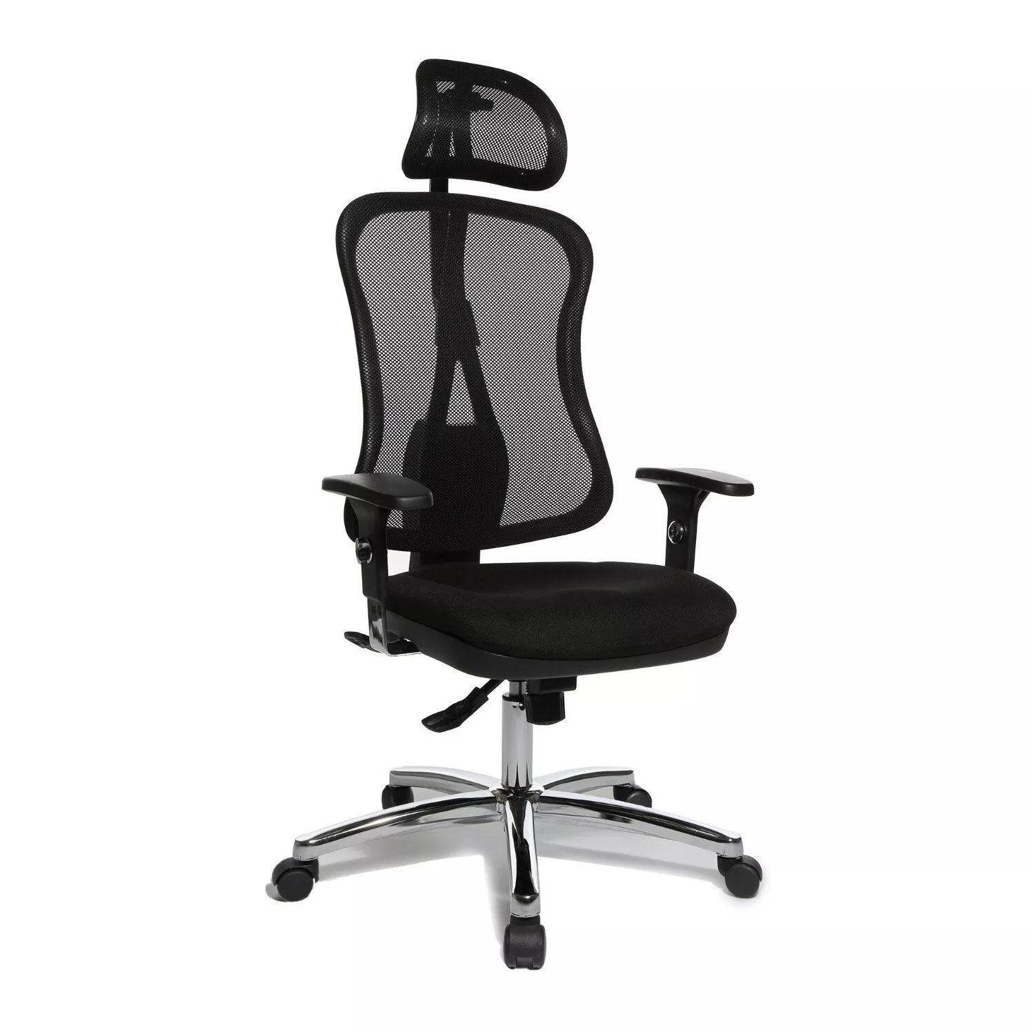 Der Spezial-Orthositz Ergo Work 45 mit konturgeformter Design-Rückenlehne ist mit einem atmungsaktiven Netzbezug in schwarz ausgestattet. Mit einer stufenlosen Sitzhöhenverstellung durch Sicherheitsgasdruckfeder variabel in der Höhe verstellbar. Die bequeme S-Form-Rückenlehne fördert die Lendenwirbelunterstützung. Der strapazierfähige Stoffbezug in schwarz ist aus 75 % Schurwolle und 25 % Polyamid sowie der Netzbezug aus 100 % Polyester gefertigt. Die angebrachte Multifunktionskopfstütze in schwarz ist in Höhe und Neigung auf den jeweiligen Nutzer einstellbar. Auch die geraden Armlehnen sind höhenverstellbar und somit ganz individuell anpassbar.