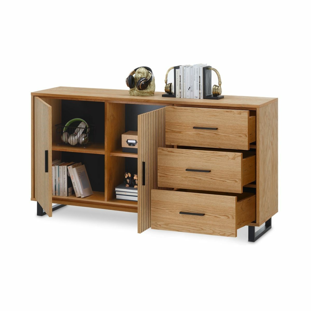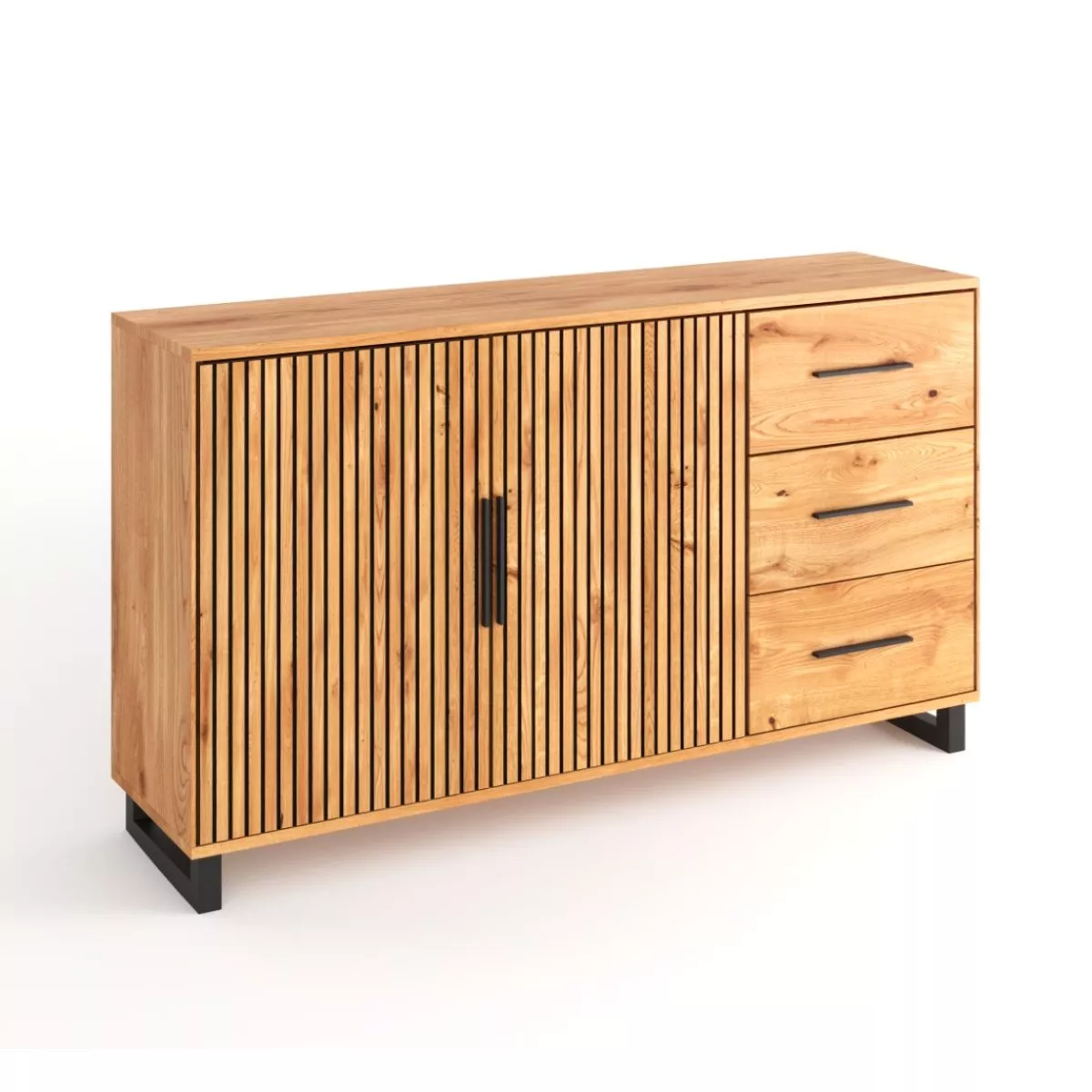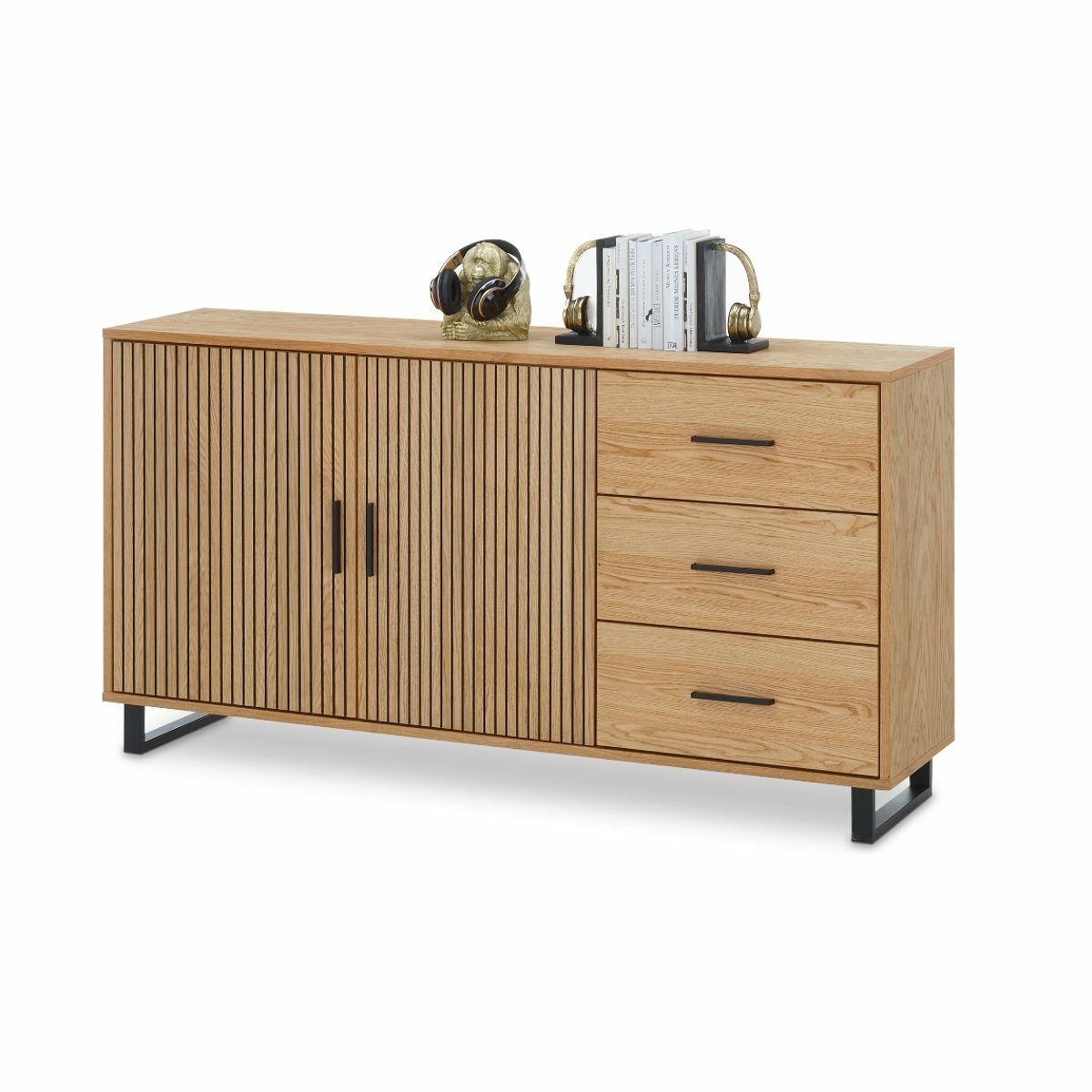 Emila weiß mit einem modernen Design mit Akustikpaneel Optik an der Frontseite zu begeistern. Das Material – Eiche Furnier – wirkt nordisch leicht und sorgt für eine gemütliche Atmosphäre. Die Griffe und Füße aus schwarzem Metall bilden einen schönen Kontrast und sorgen für einen Hauch Industrial Flair.