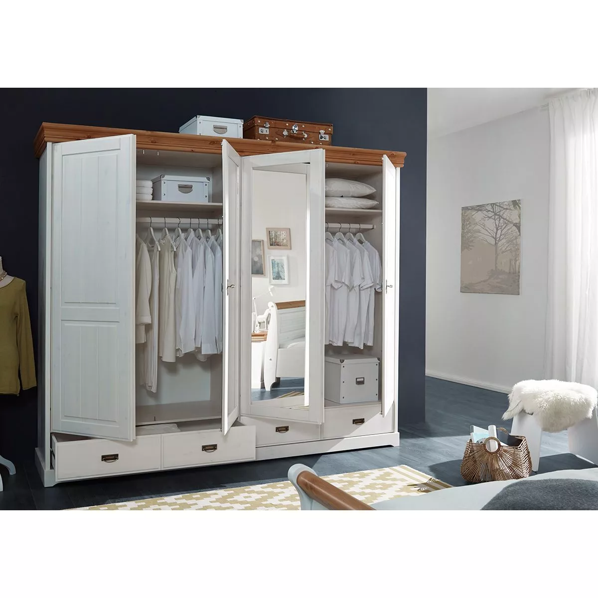 Der Gaius Kleiderschrank von Trendstore bringt den charmanten Landhausstil in Ihr Schlafzimmer. Er ist aus massiver Kiefer gefertigt und begeistert mit seinem weiß gewachsten Look und dekorativen Akzenten. Zudem bietet er hinter seinen vier Drehtüren und in zwei Schubladen viel Stauraum.