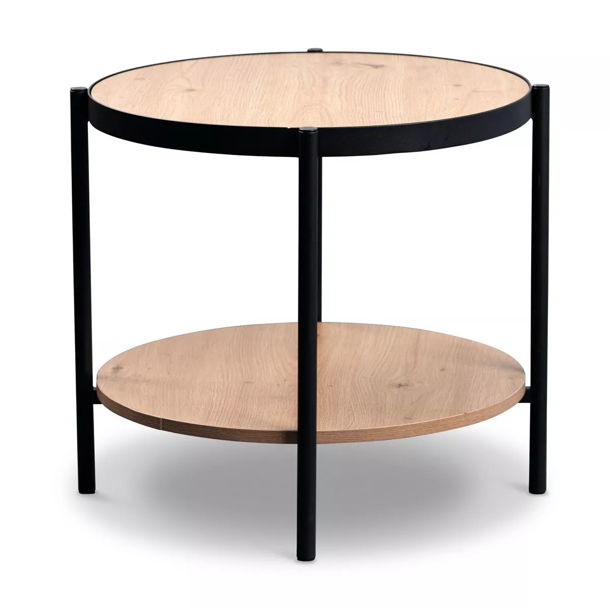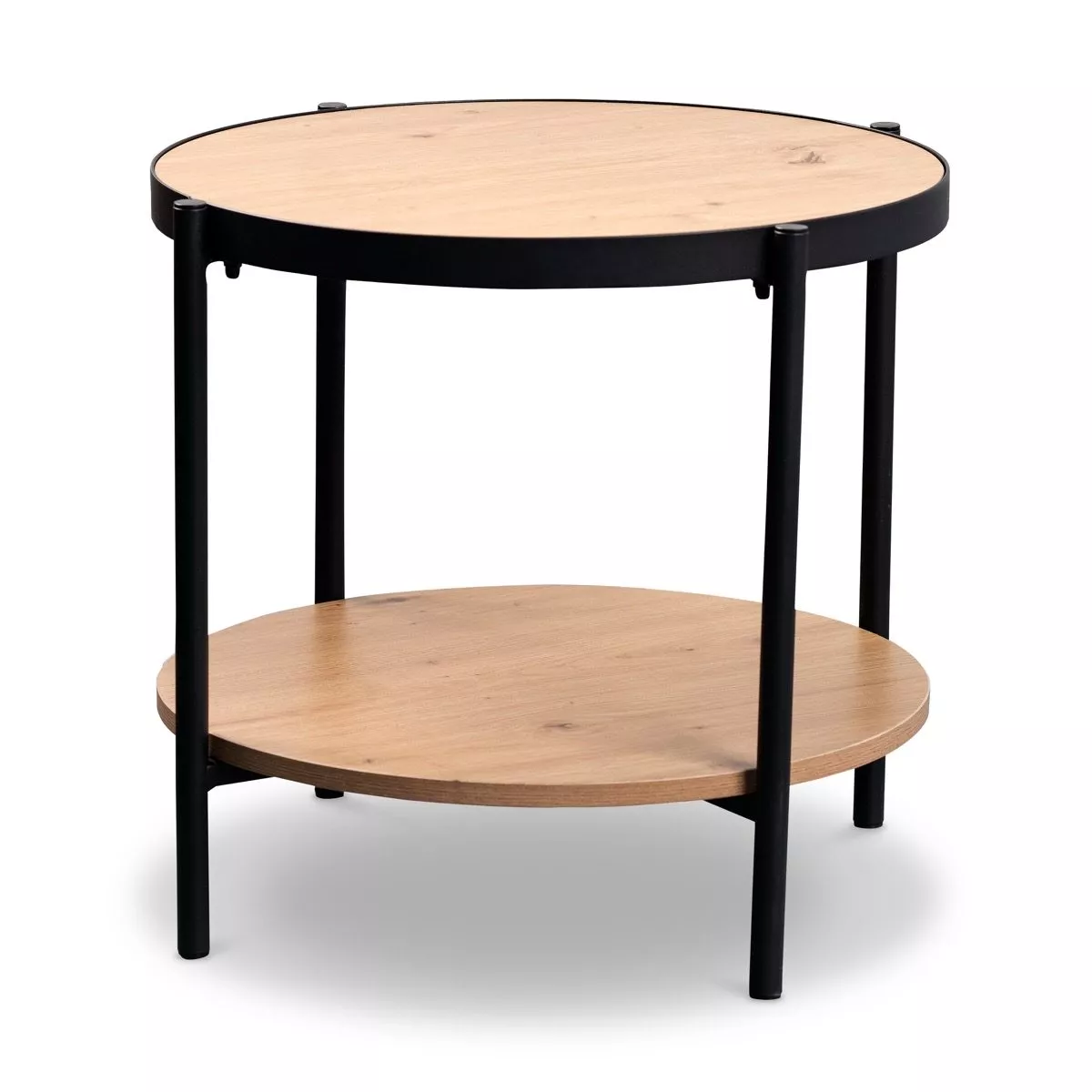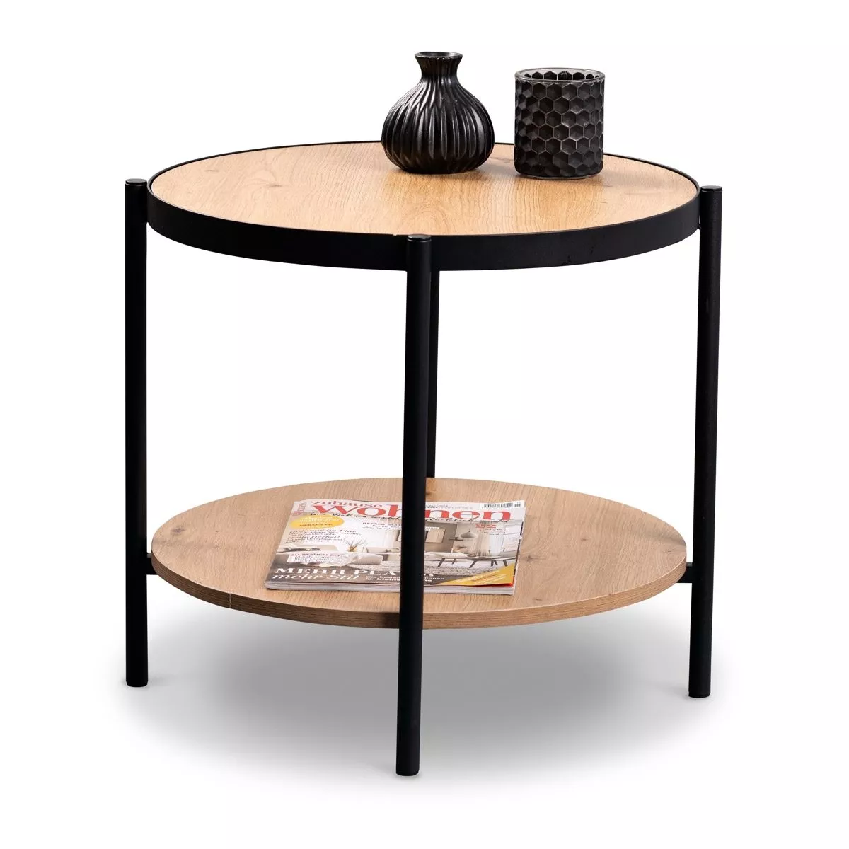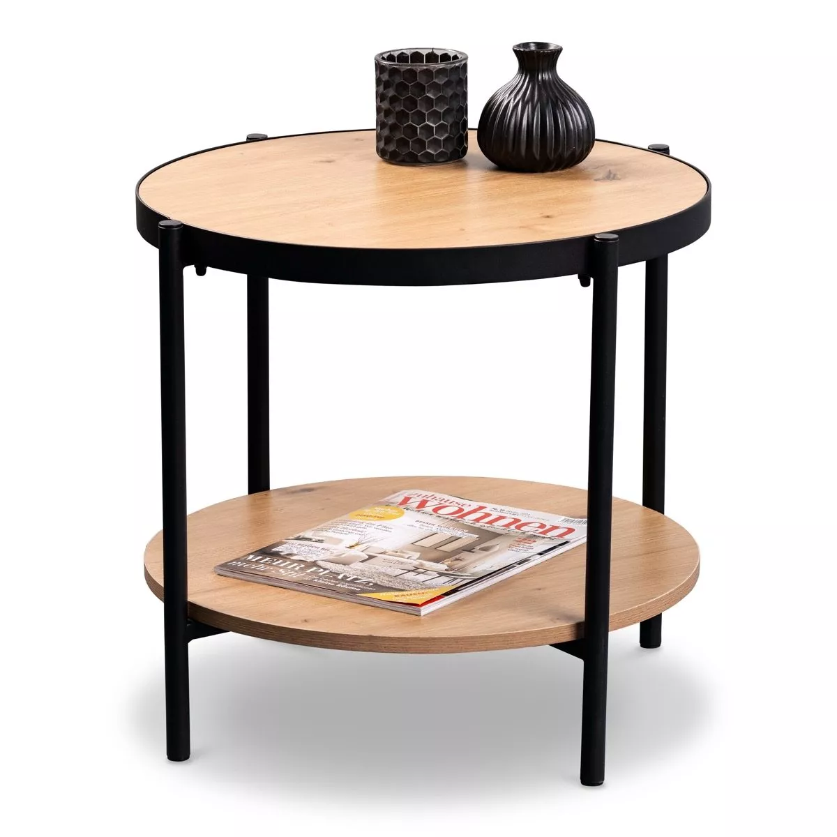 Die runde Tischplatte in Artisan Eiche Nachbildung verleiht dem Beistelltisch eine warme, einladende Optik. Getragen wird sie von einem stabilen, schwarzen Metallgestell, das für einen modernen und zugleich zeitlosen Look sorgt. Die Kombination aus Holzoptik und Metall fügt sich harmonisch in verschiedenste Einrichtungsstile ein.