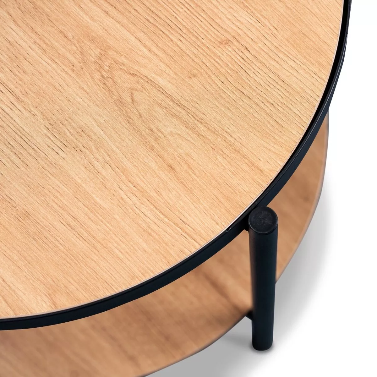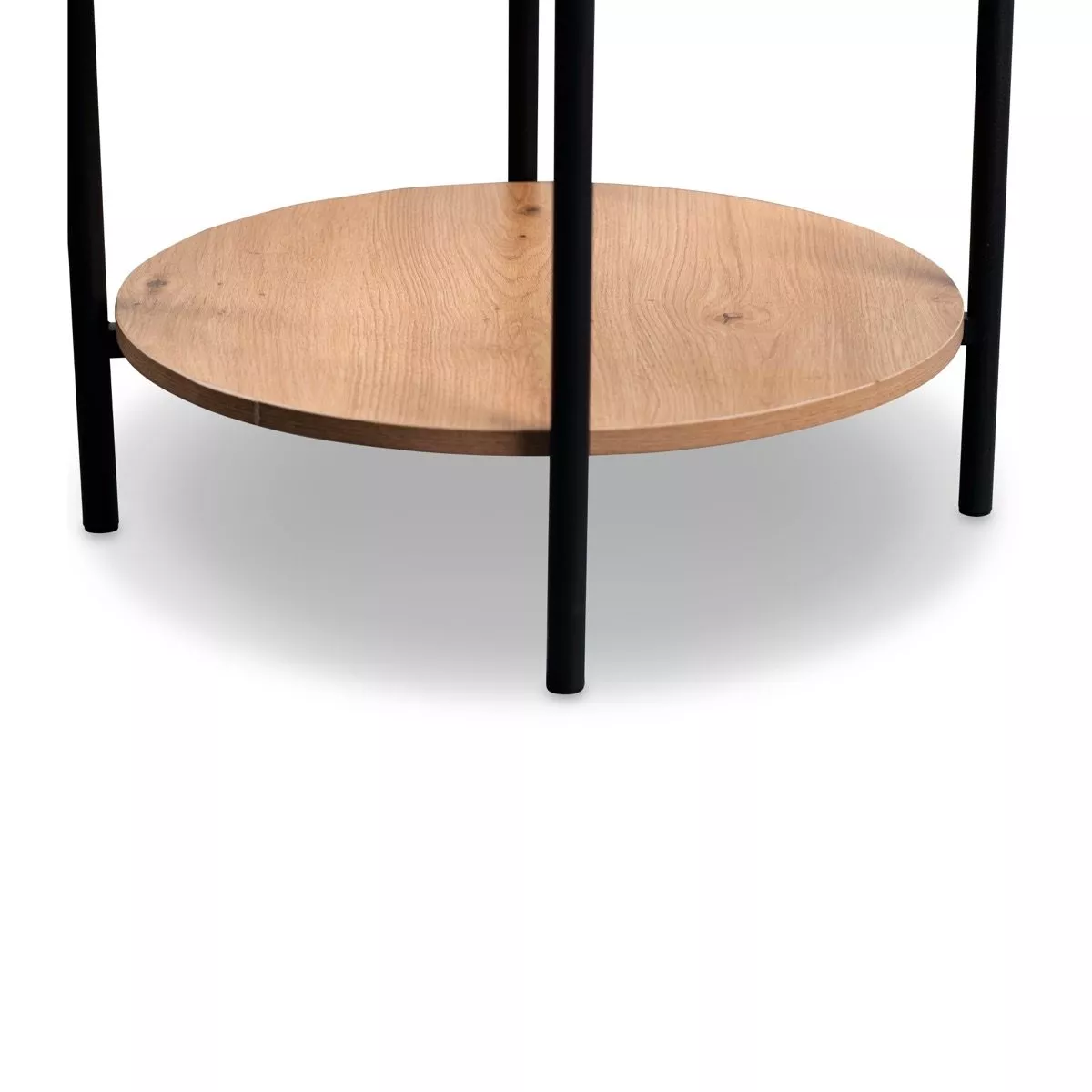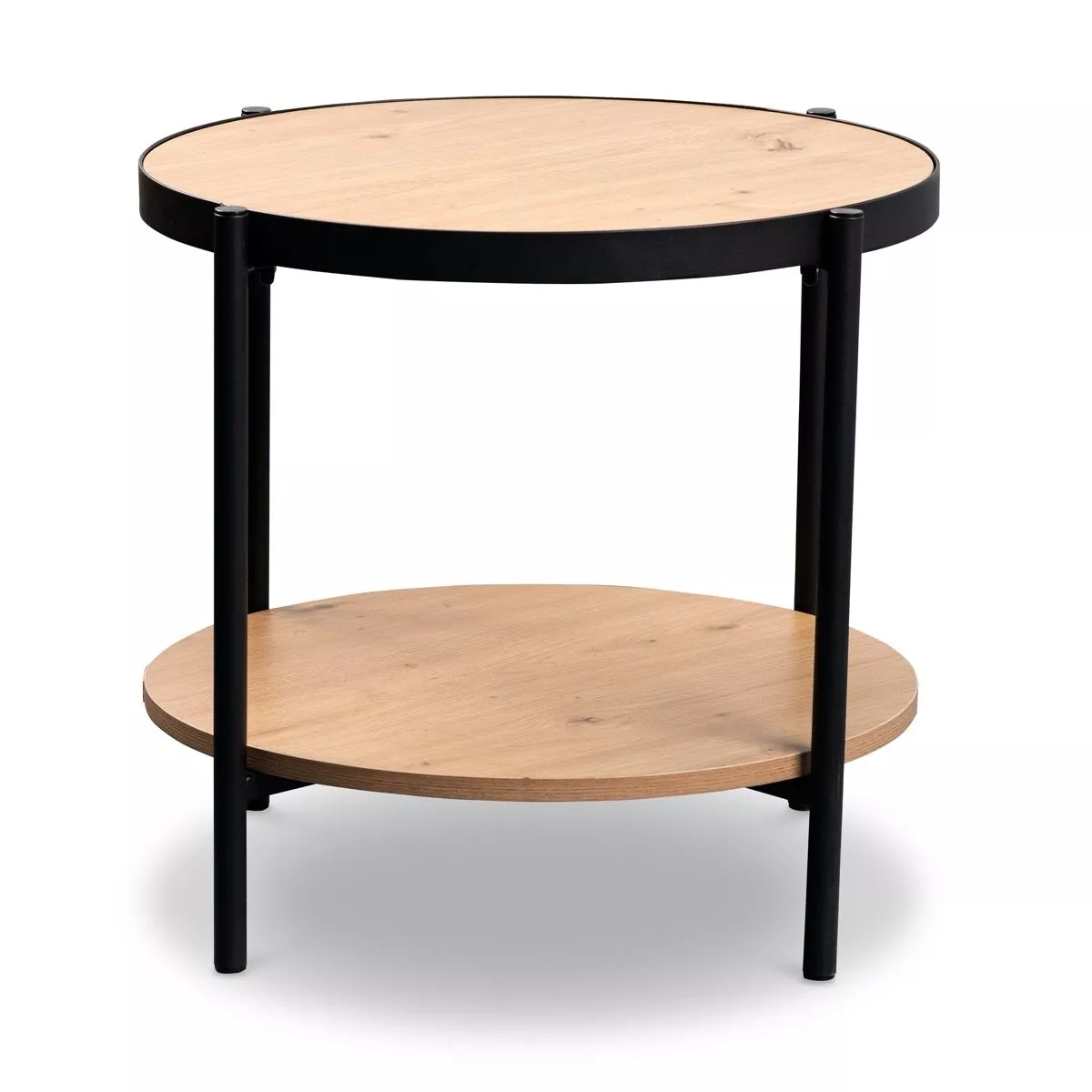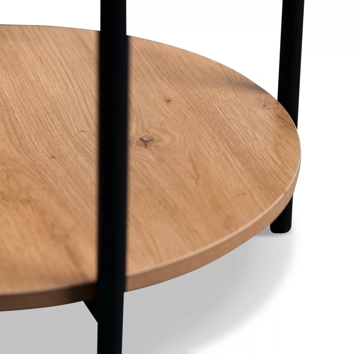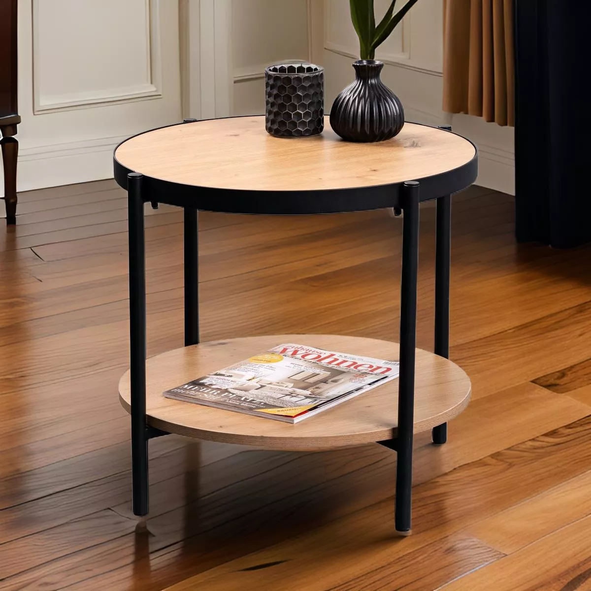 Die runde Tischplatte in Artisan Eiche Nachbildung verleiht dem Beistelltisch eine warme, einladende Optik. Getragen wird sie von einem stabilen, schwarzen Metallgestell, das für einen modernen und zugleich zeitlosen Look sorgt. Die Kombination aus Holzoptik und Metall fügt sich harmonisch in verschiedenste Einrichtungsstile ein.