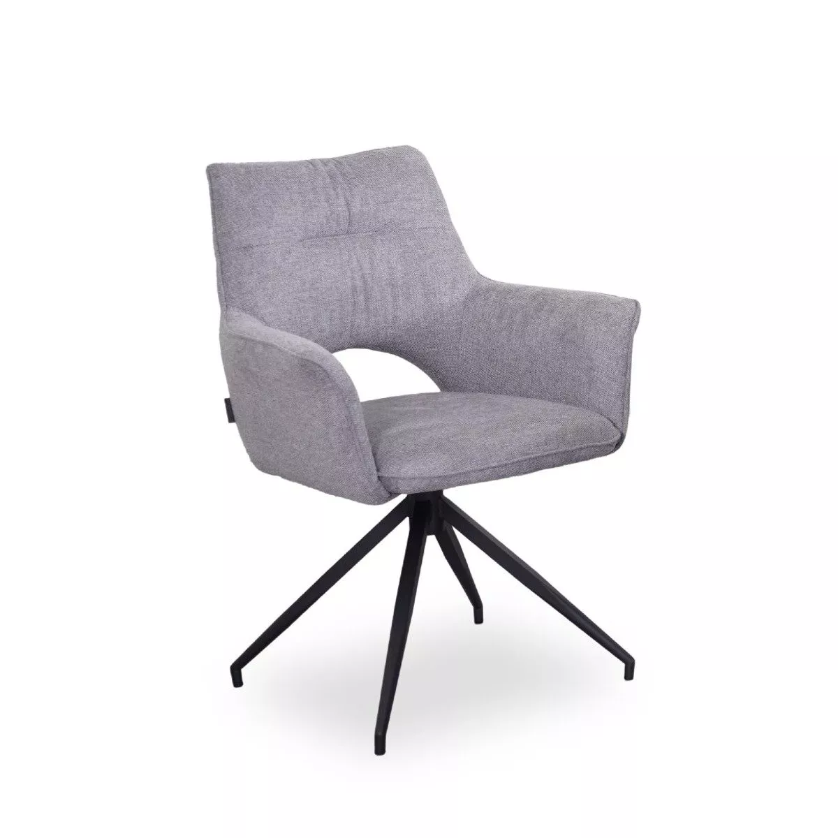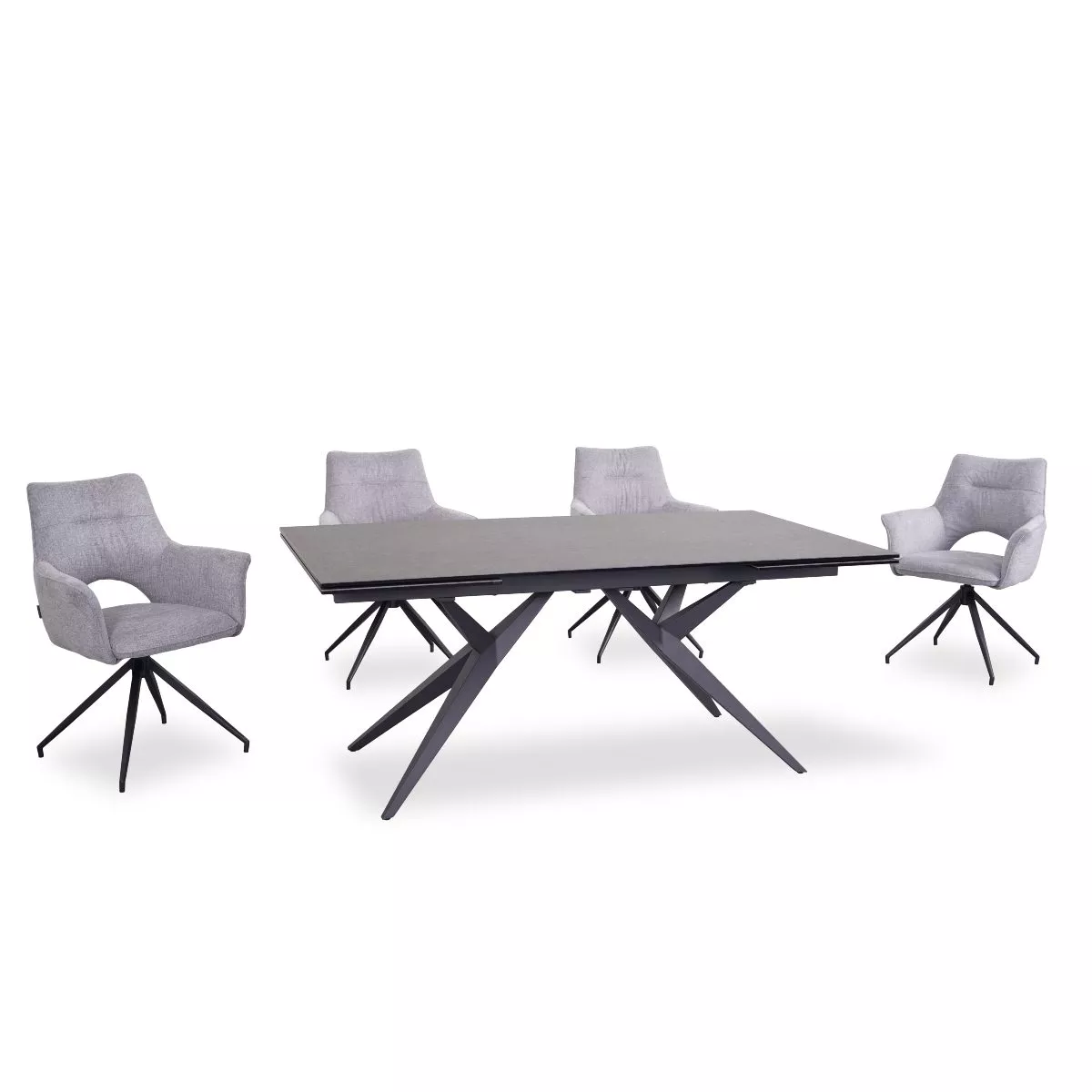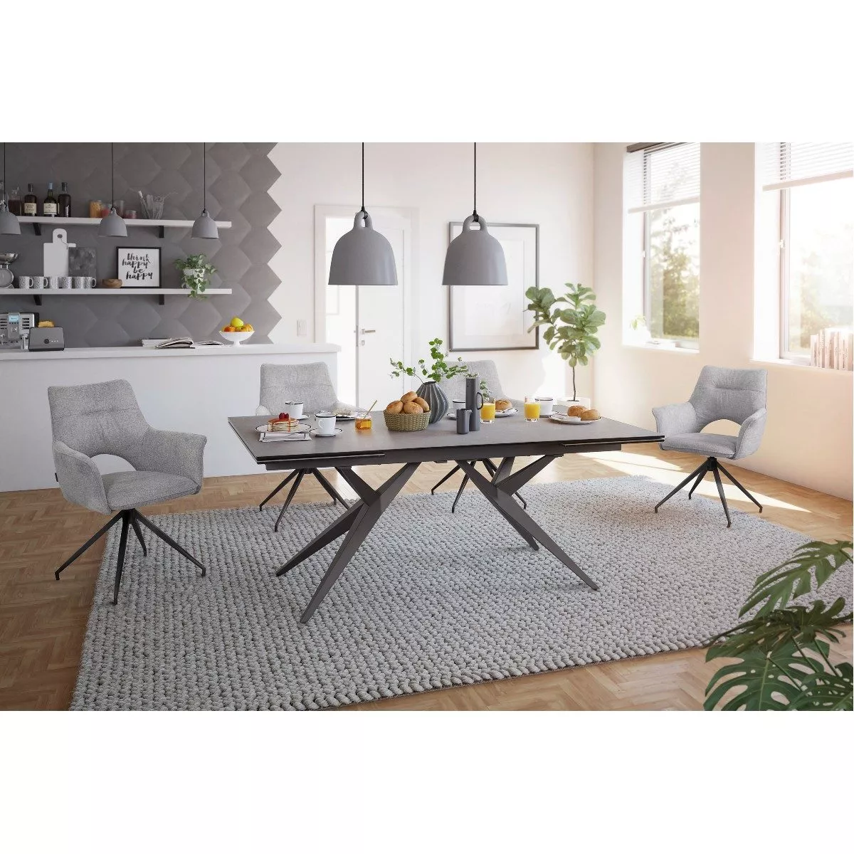 Die Essgruppe umfasst außerdem vier stilvolle Stühle mit Armlehnen, die auf einem stabilen Metallgestell in Schwarz stehen. Ein besonderes Highlight ist die 360°-Drehfunktion der Stühle, die für zusätzlichen Komfort und Flexibilität sorgt.