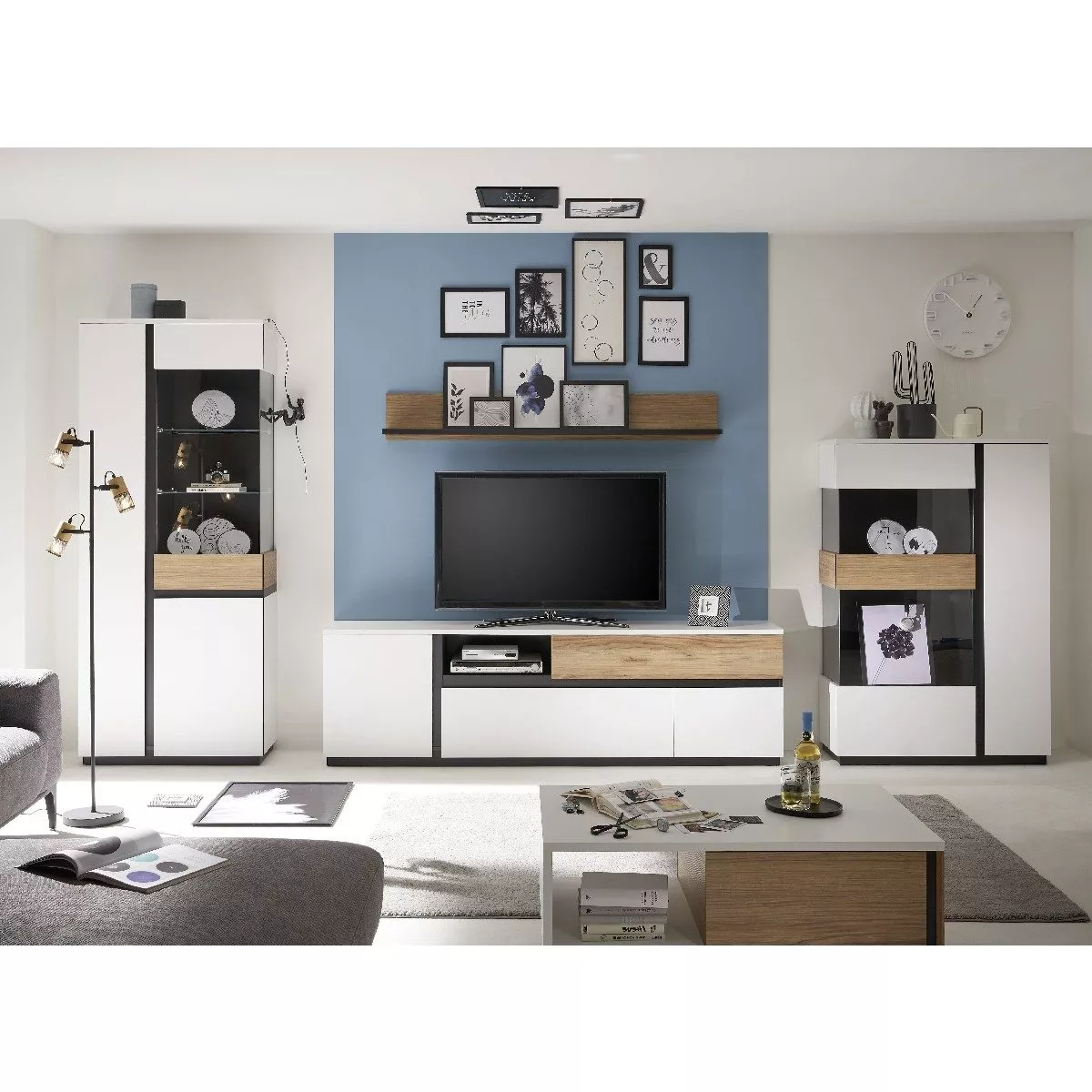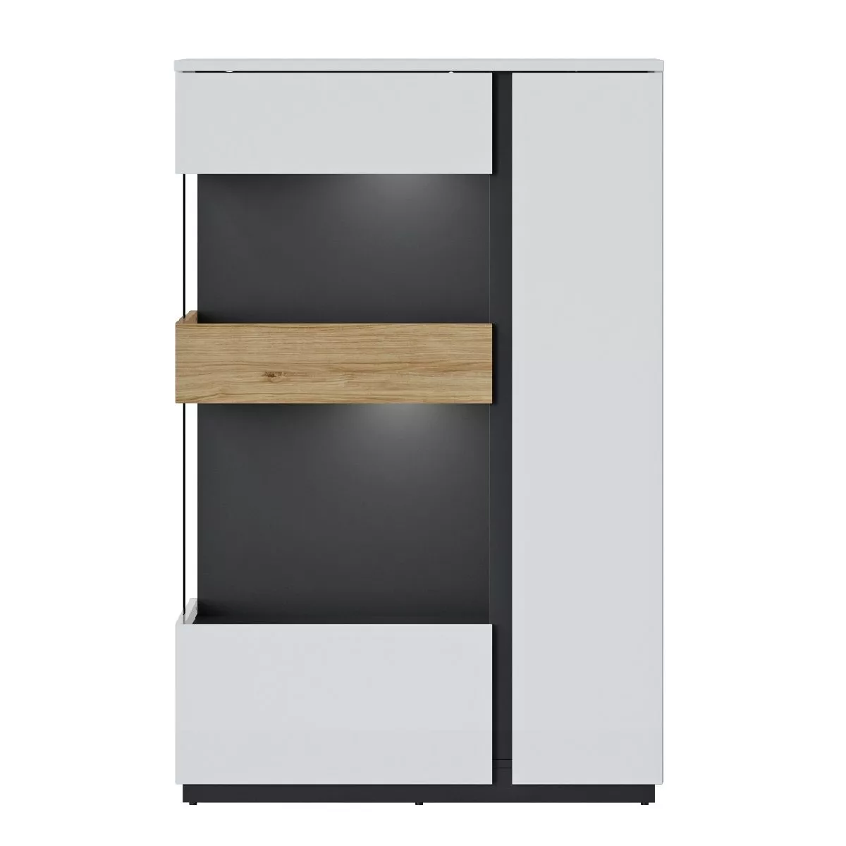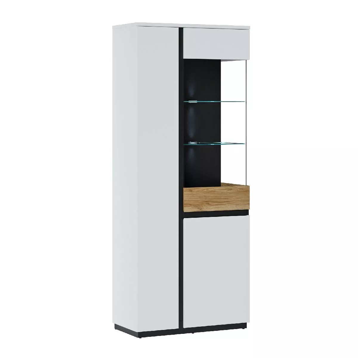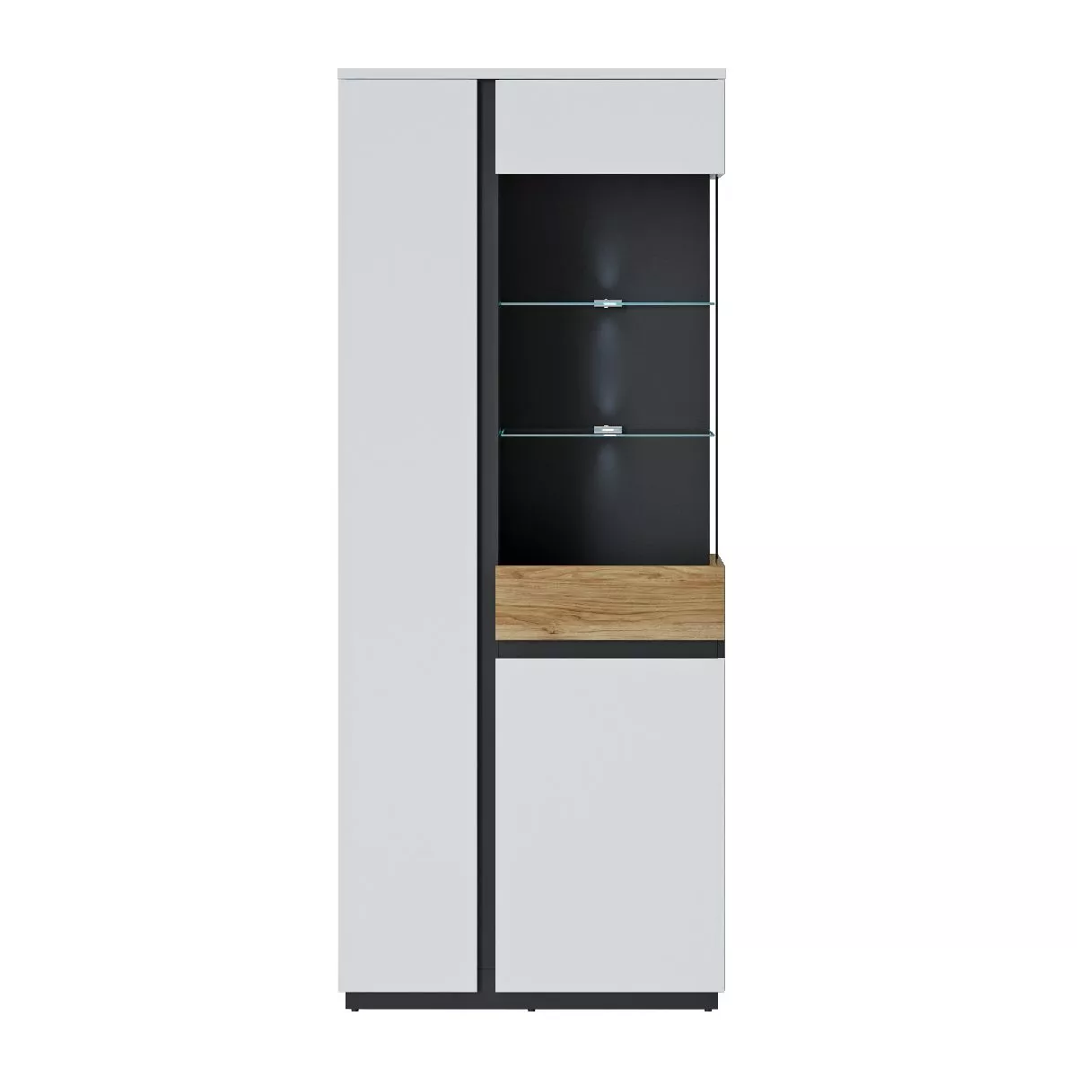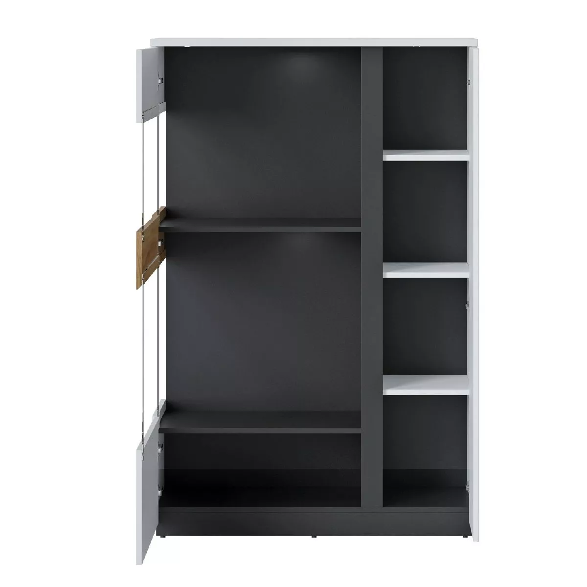 Sie mögen Abwechslung? Dann gefällt Ihnen das Design von Walea ganz bestimmt. Bei diesem Schrank gehen die Dekors in weiß, schwarz und Catania Eiche Nachbildung eine stilvolle Verbindung ein. Dazwischen geben integrierte Glasflächen einen Blick ins Innere.