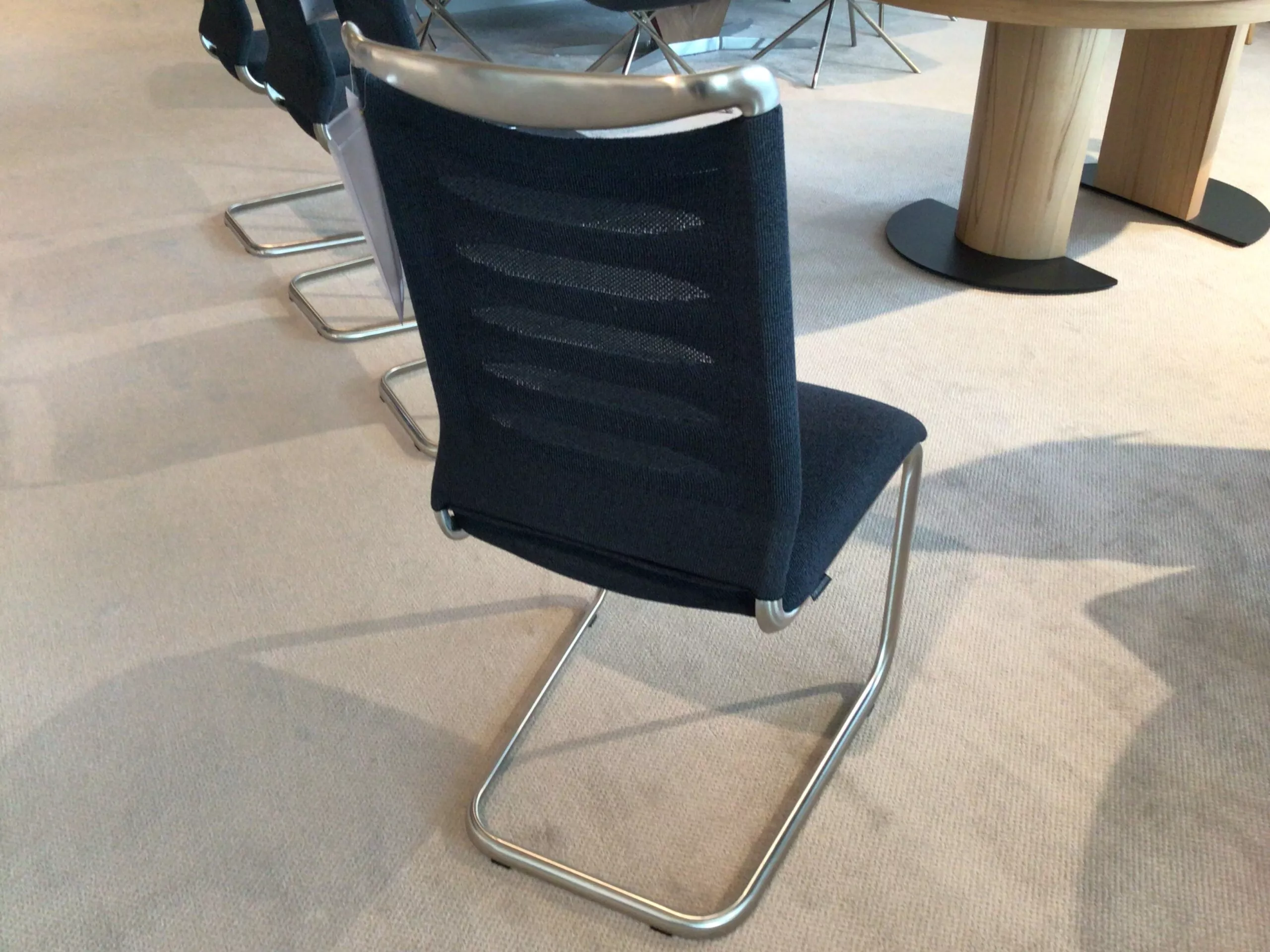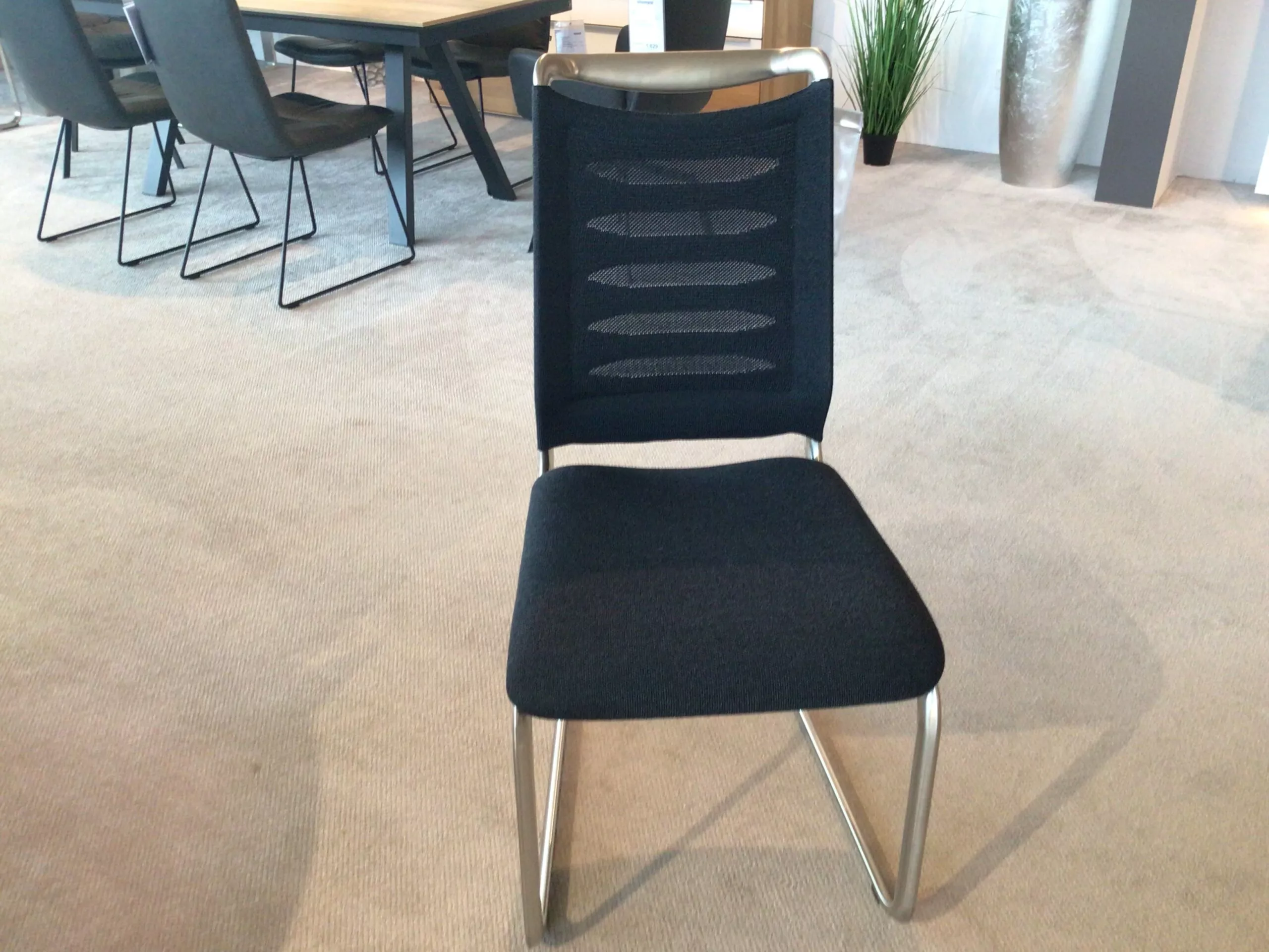 Hochwertiger Stuhl von Venjakob in Anthrazit und Gestell in Edelstahloptik.