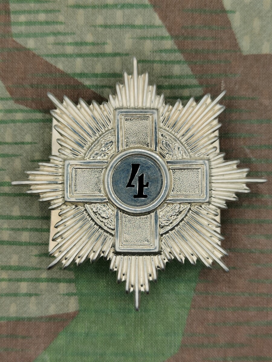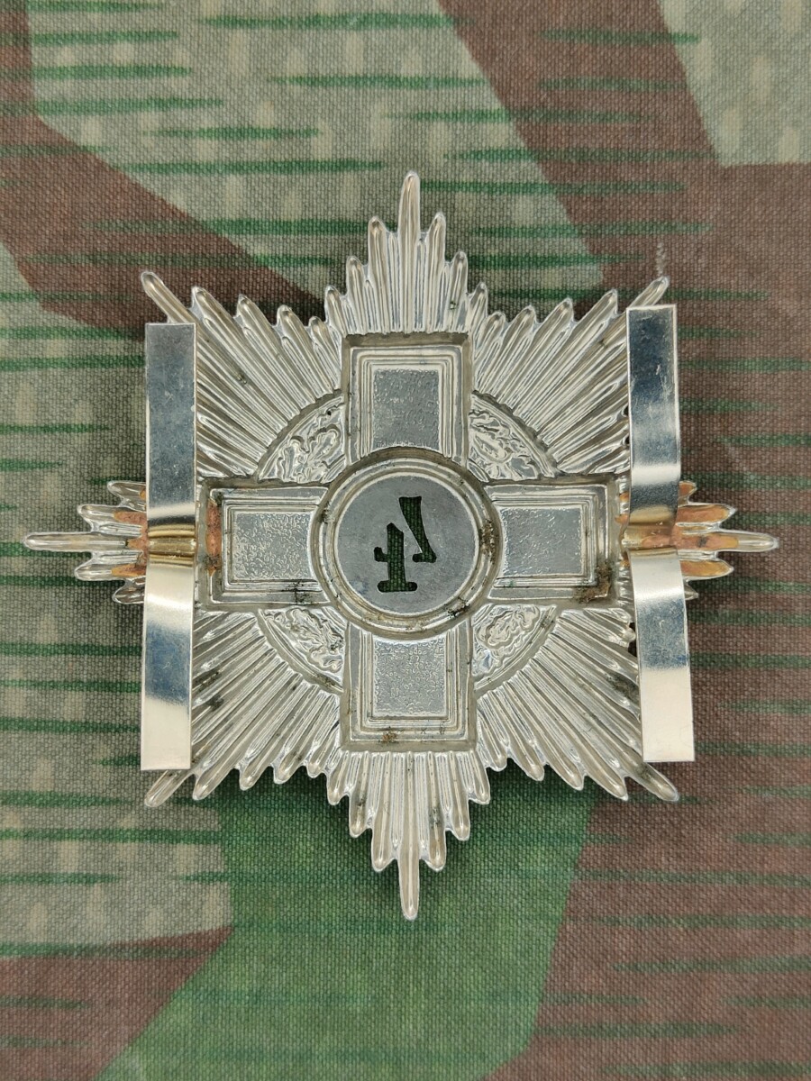 Das Emblem zeigt einen Schild in der Form eines 8-zackigen Sterns mit Kreuz und Eichenkranz und Nummerring.