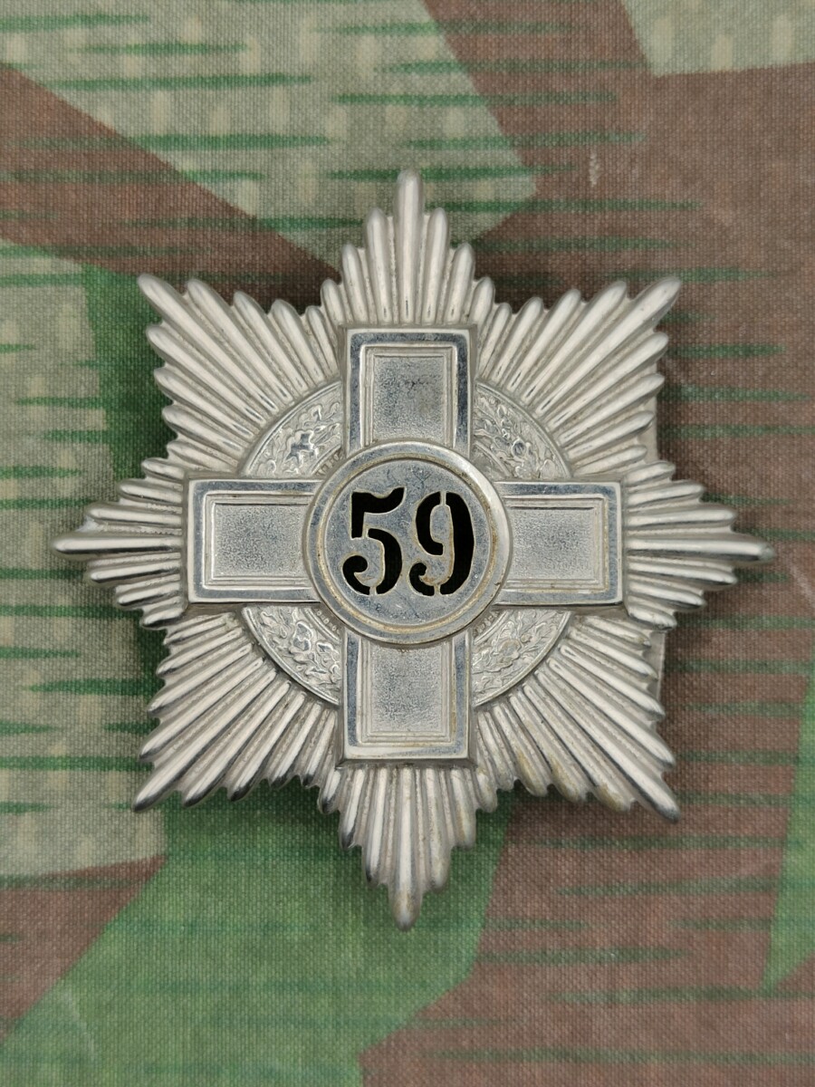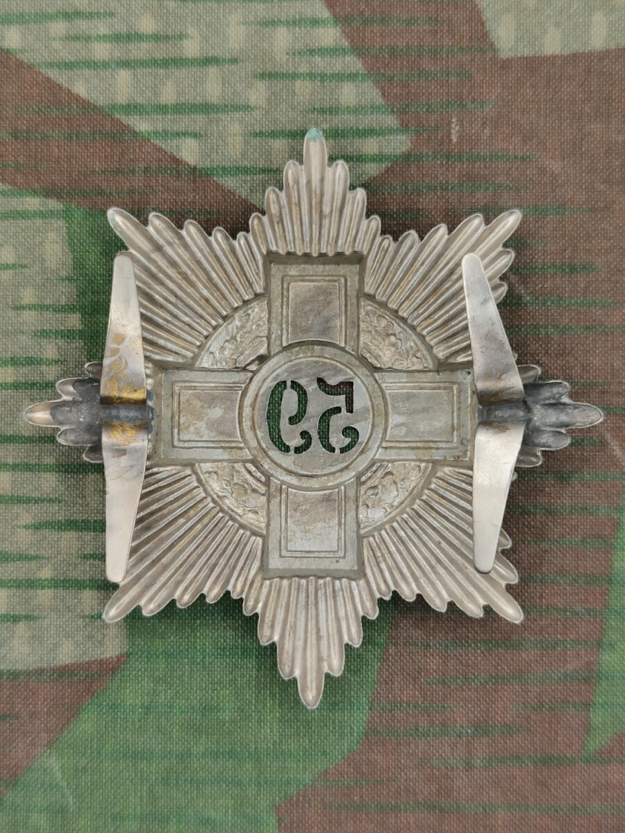 Das Emblem zeigt einen Schild in der Form eines 8-zackigen Sterns mit Kreuz und Eichenkranz und Nummerring.