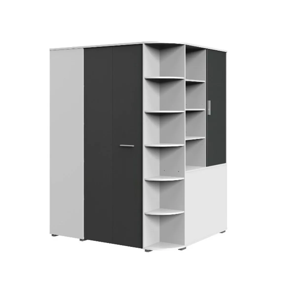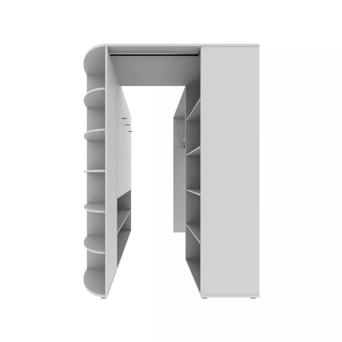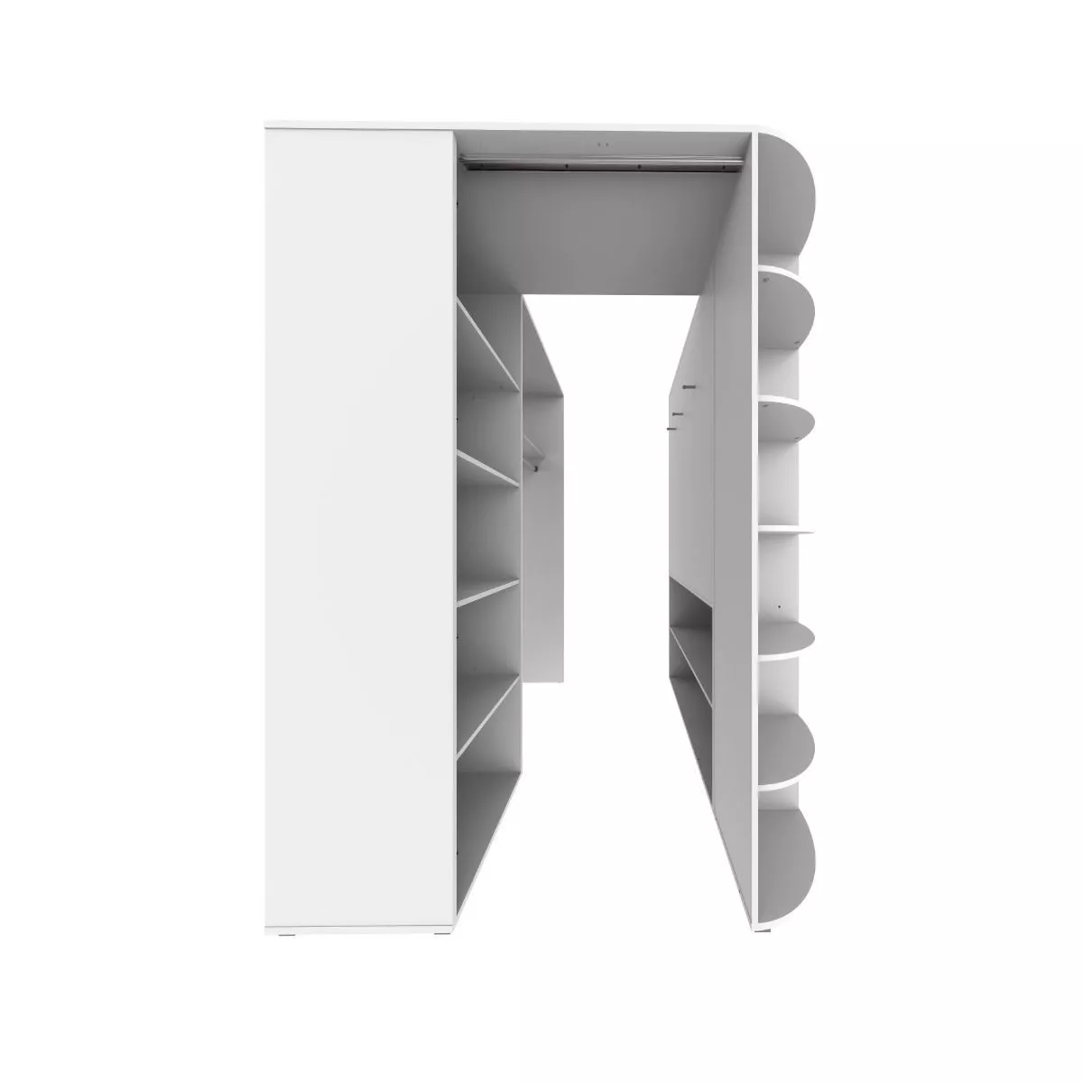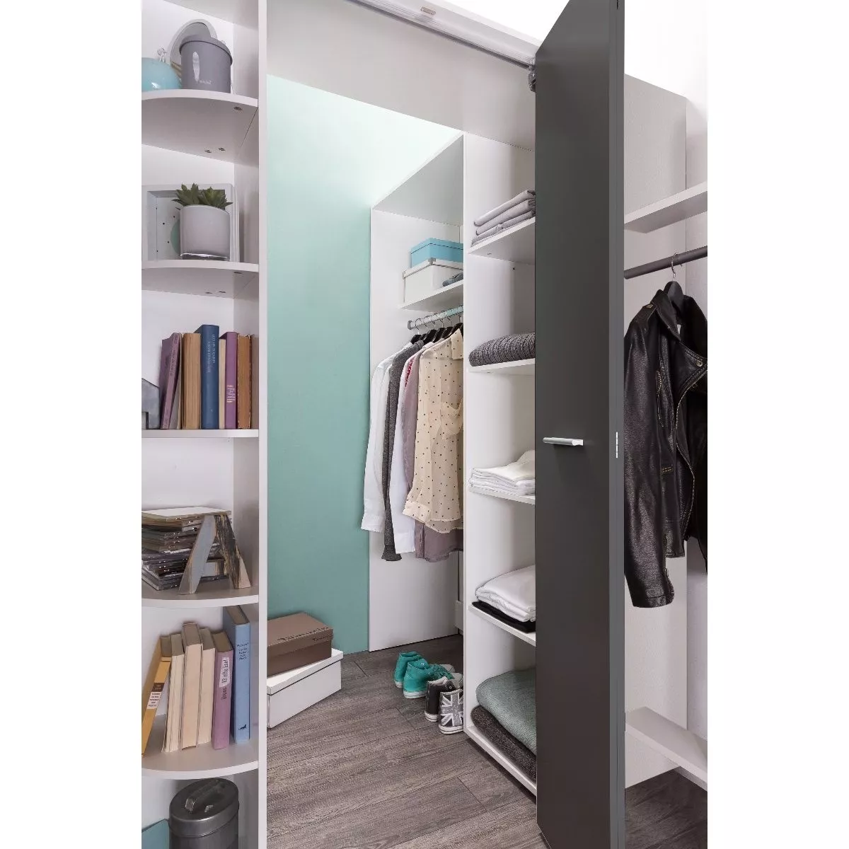 Ein großzügiger Eckschrank, der begehbar ist und im Innenraum viel Stauraum bietet, ist ebenfalls enthalten. Zudem verfügt dieser Eckschrank auf der Außenseite über offene und geschlossene Regale, in denen beispielsweise Bücher oder Deko Platz finden. An der Garderobe, die an dem Eckschrank befestigt ist, können Jacken, Taschen und Accessoires aufgehängt werden.