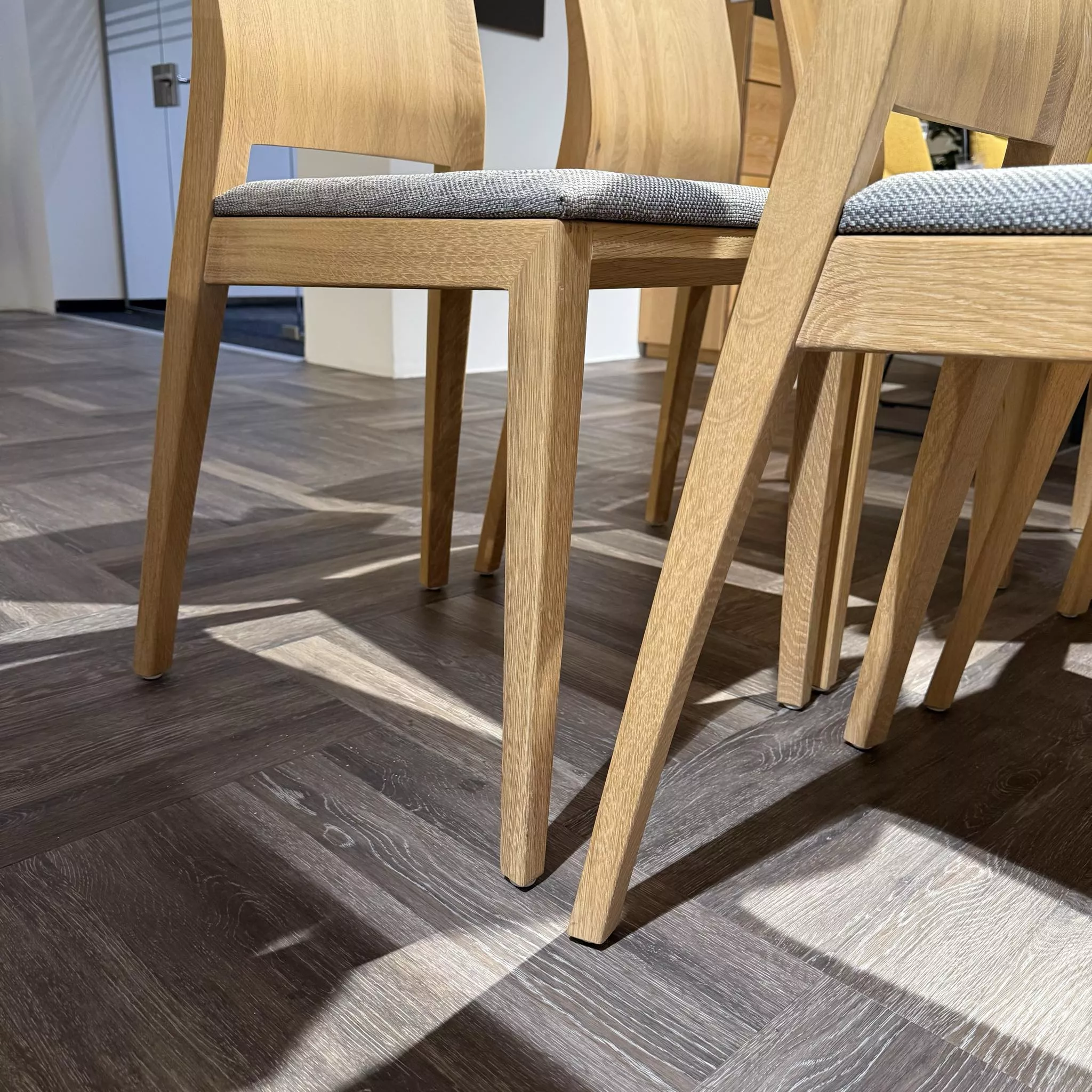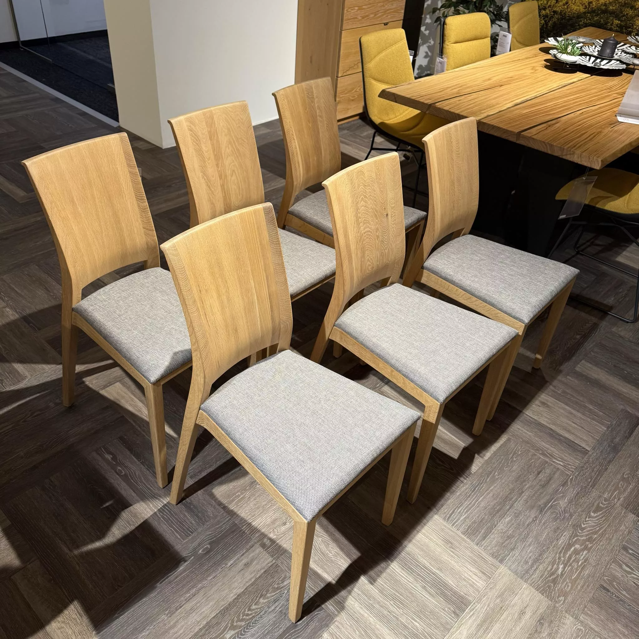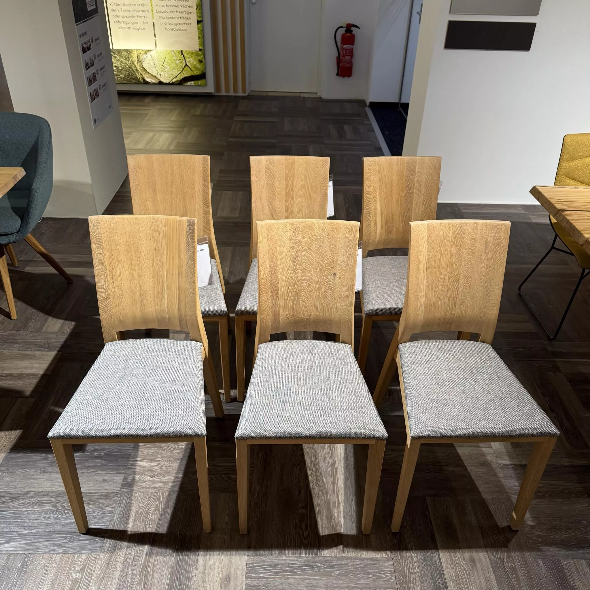 6er-Stuhlgruppe von Wimmer mit Bezug aus Textilgewebe in Verano Silber und Gestell aus rustikaler Asteiche Bianco.